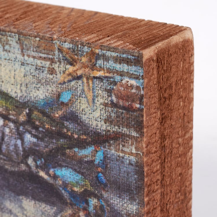 A wooden block sign from our Beach Collection displaying a charming beach inspired design of a blue crab in the sand with seashells. Blue crab design is replicated from original artwork painted onto burlap canvas, giving the art a unique depth and texture. Beach block sign features distressed details with coordinating natural wood on the sides and back. Our Blue Crab block sign is easy to hang via predrilled keyhole slot or can free-stand alone. A rustic beach-themed home accent that can be easily displayed in any home or work space.