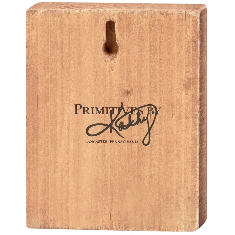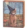 A wooden block sign from our Halloween Collection displaying a charming hand painted fall scene of a orange cat in a witch hat. Design is replicated from original artwork painted onto burlap canvas, giving the art a unique depth and texture. Seasonal block sign features distressed details with coordinating natural wood on the sides and back. Our Cat As A Witch sign is easy to hang via predrilled keyhole slot or can free-stand alone. A rustic seasonal home accent that can be easily displayed in any home or work space.