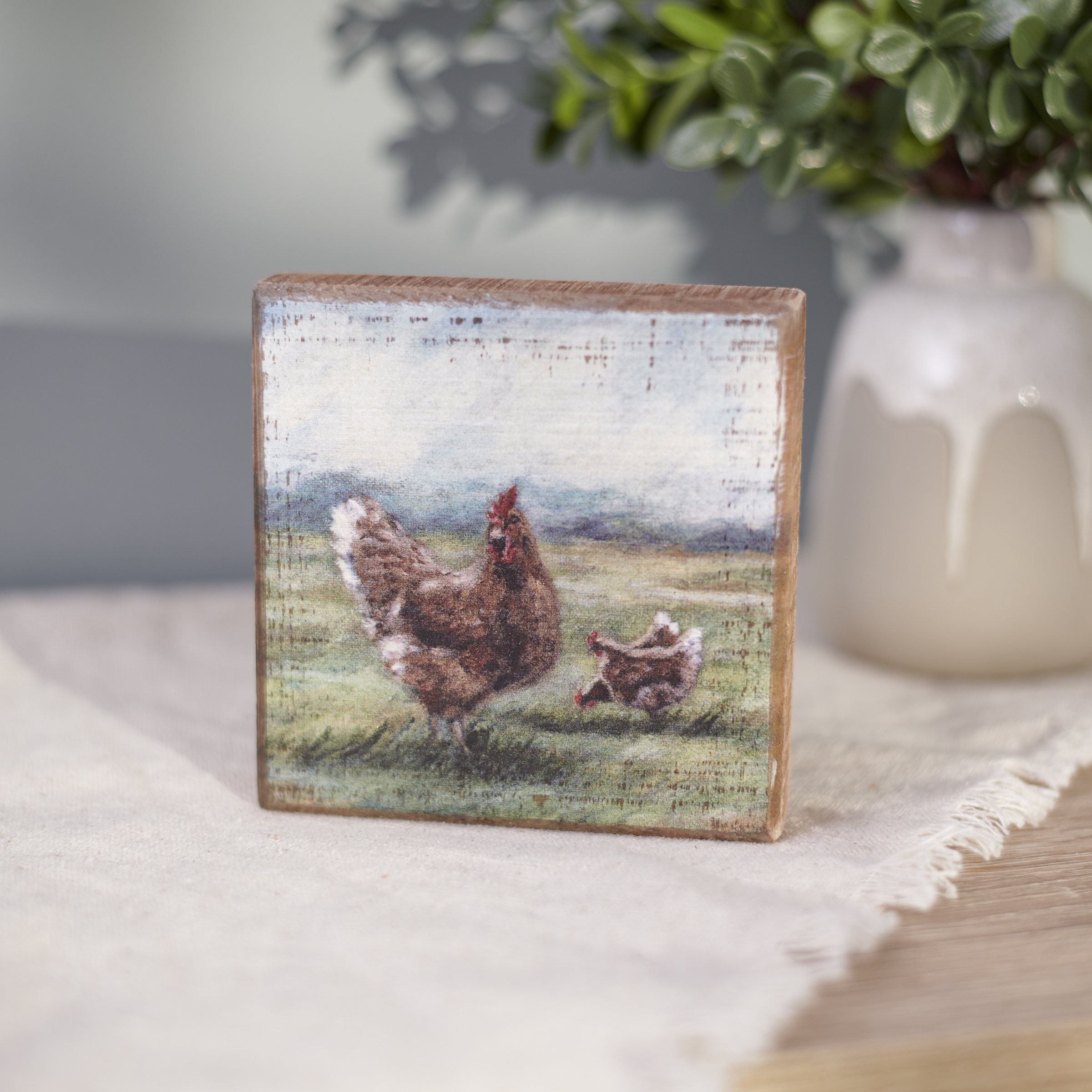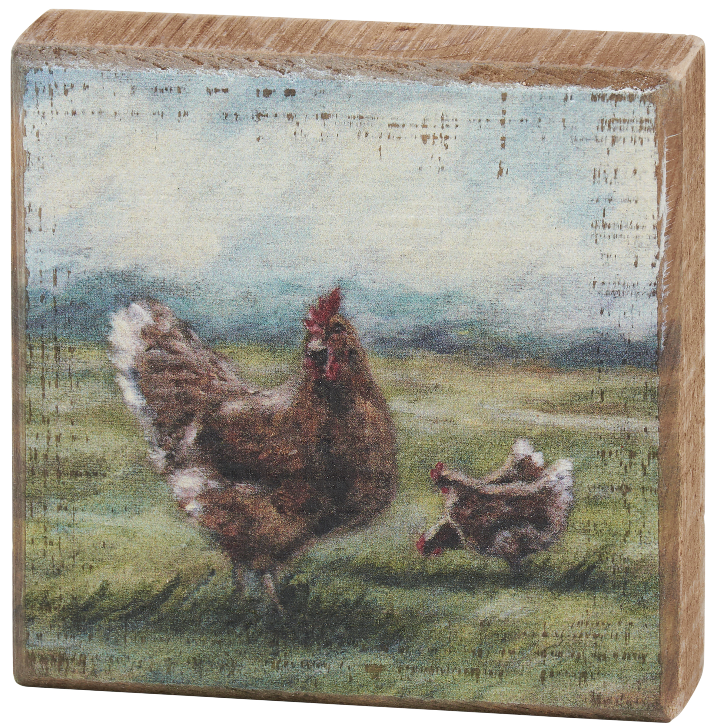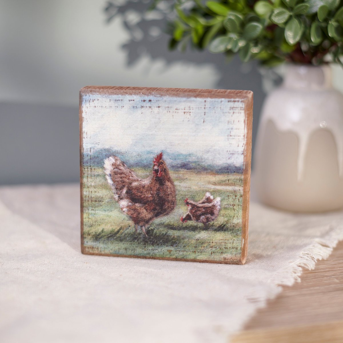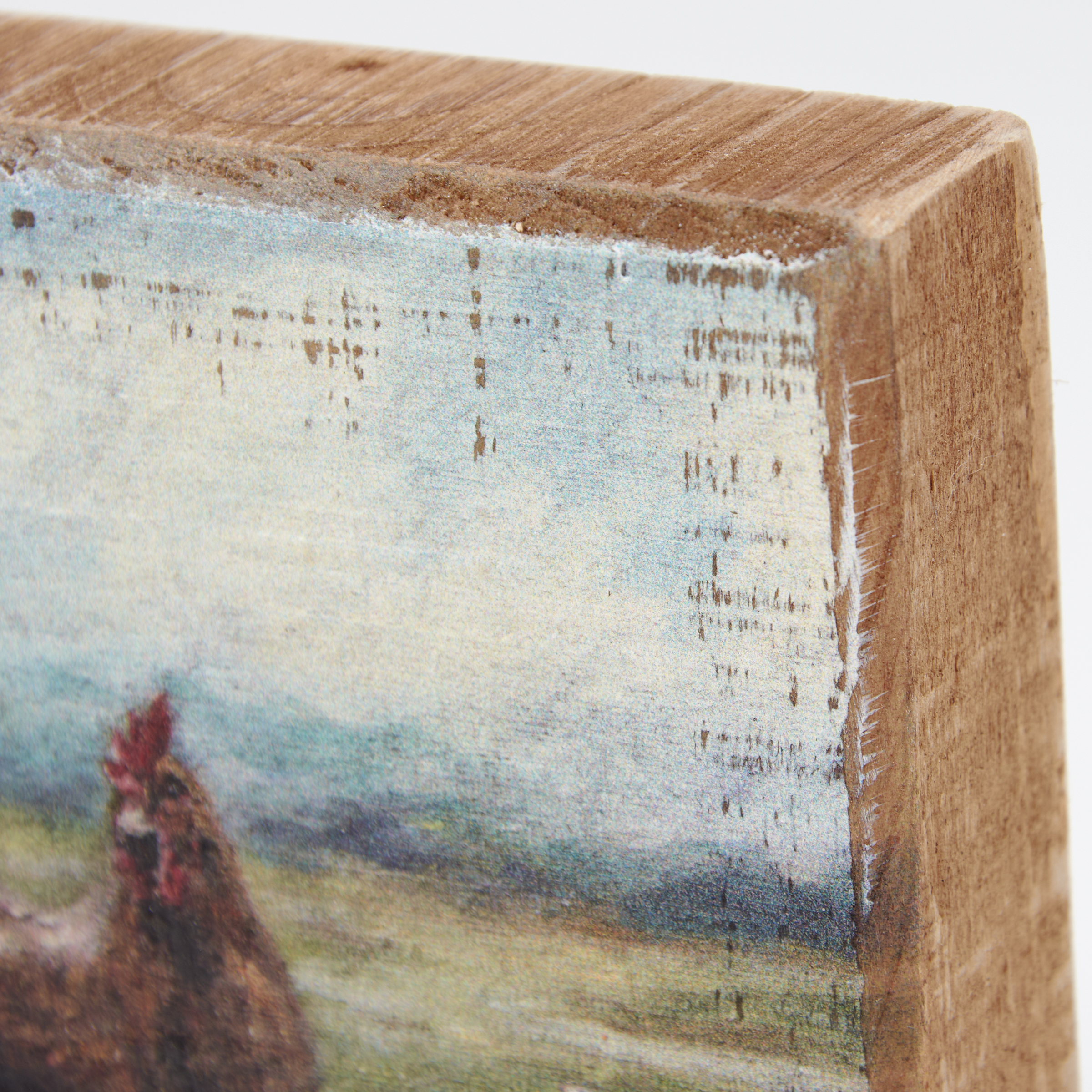 A charming wooden block sign from our Farmhouse Collection displaying a calming hand painted design of brown chickens in an open field. Design is replicated from original artwork painted onto burlap canvas, giving the art a unique depth and texture. Block sign features distressed details with coordinating natural wood on the sides and back. Our Chicken block sign is easy to hang via predrilled keyhole slot or can free-stand alone. A rustic everyday home accent with a variety of display options.