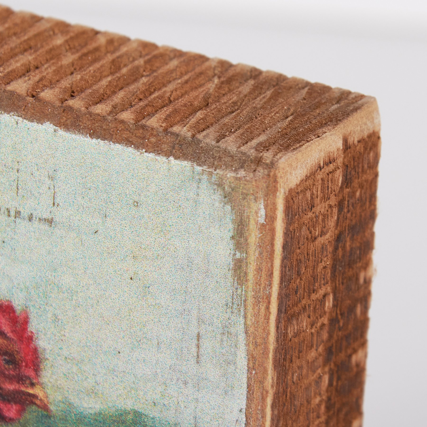 A charming wooden block sign from our Farmhouse Collection displaying a calming hand painted design of a chickens outside of a coop. Design is replicated from original artwork painted onto burlap canvas, giving the art a unique depth and texture. Block sign features distressed details with coordinating natural wood sides and back. Our Chicken Coop block sign is easy to hang via predrilled keyhole slot or can free-stand alone. A rustic everyday home accent with a variety of display options.