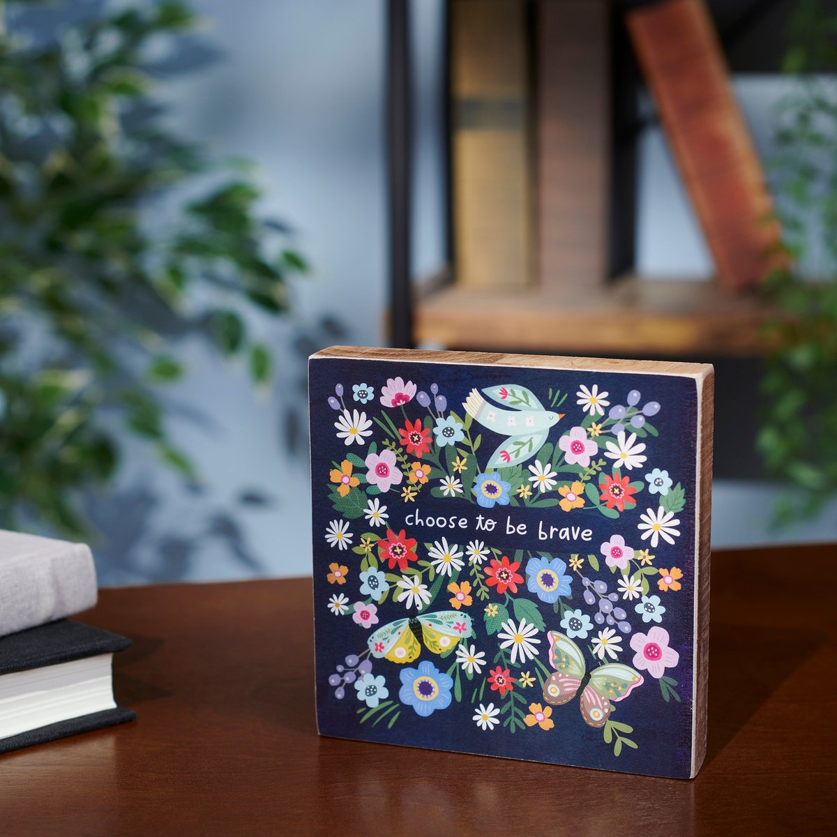 A colorful wooden block sign from our Inspiration & Blooms Collection displaying hand illustrated abstract florals with birds and butterflies surrounding an inspirational sentiment that reads "Choose To Be Brave." Inspirational block sign features coordinating natural wood on the sides and back. Our Choose Brave sign is easy to hang via predrilled keyhole slot or can free-stand alone. An inspirational home accent great for gifting that can be easily displayed in any home or work space.