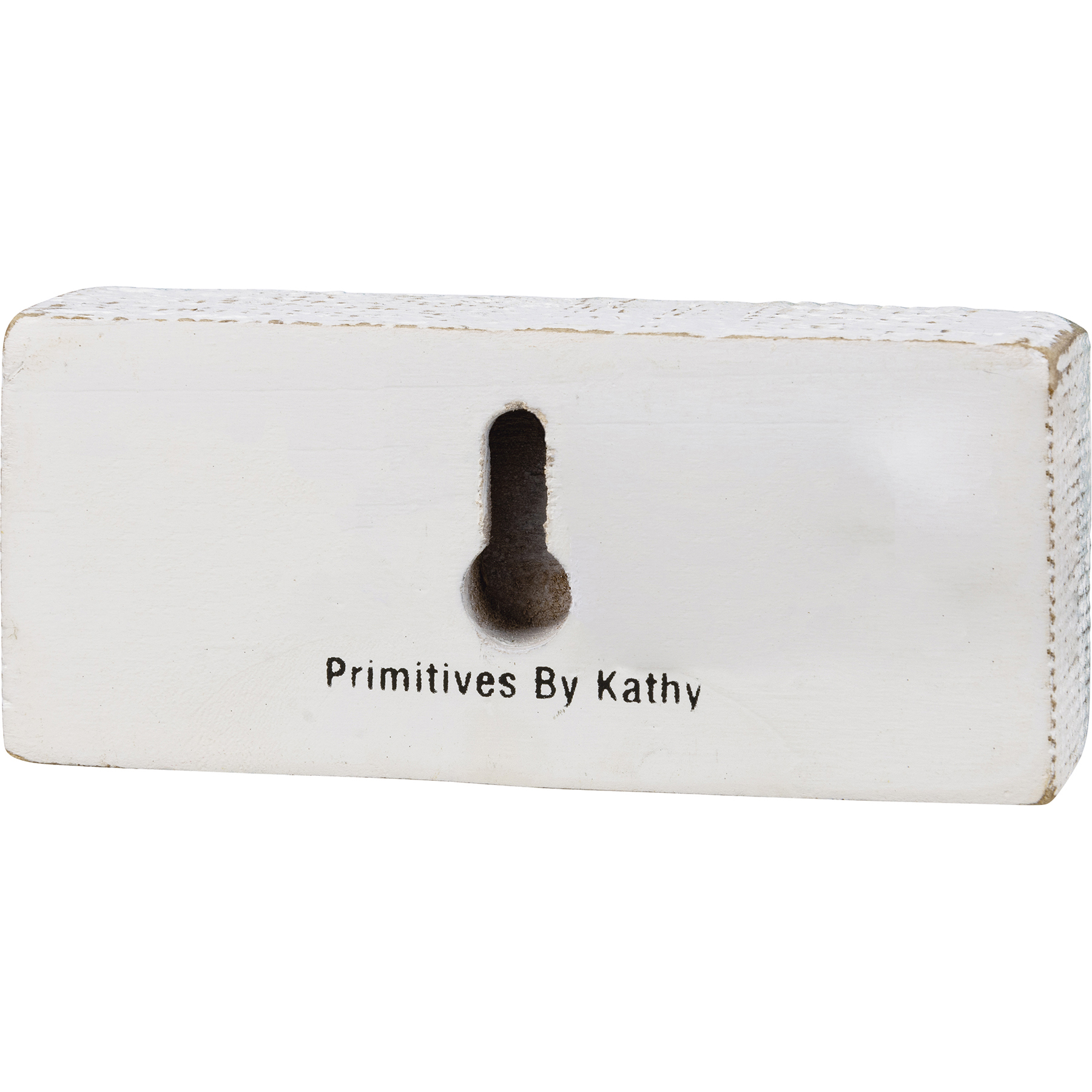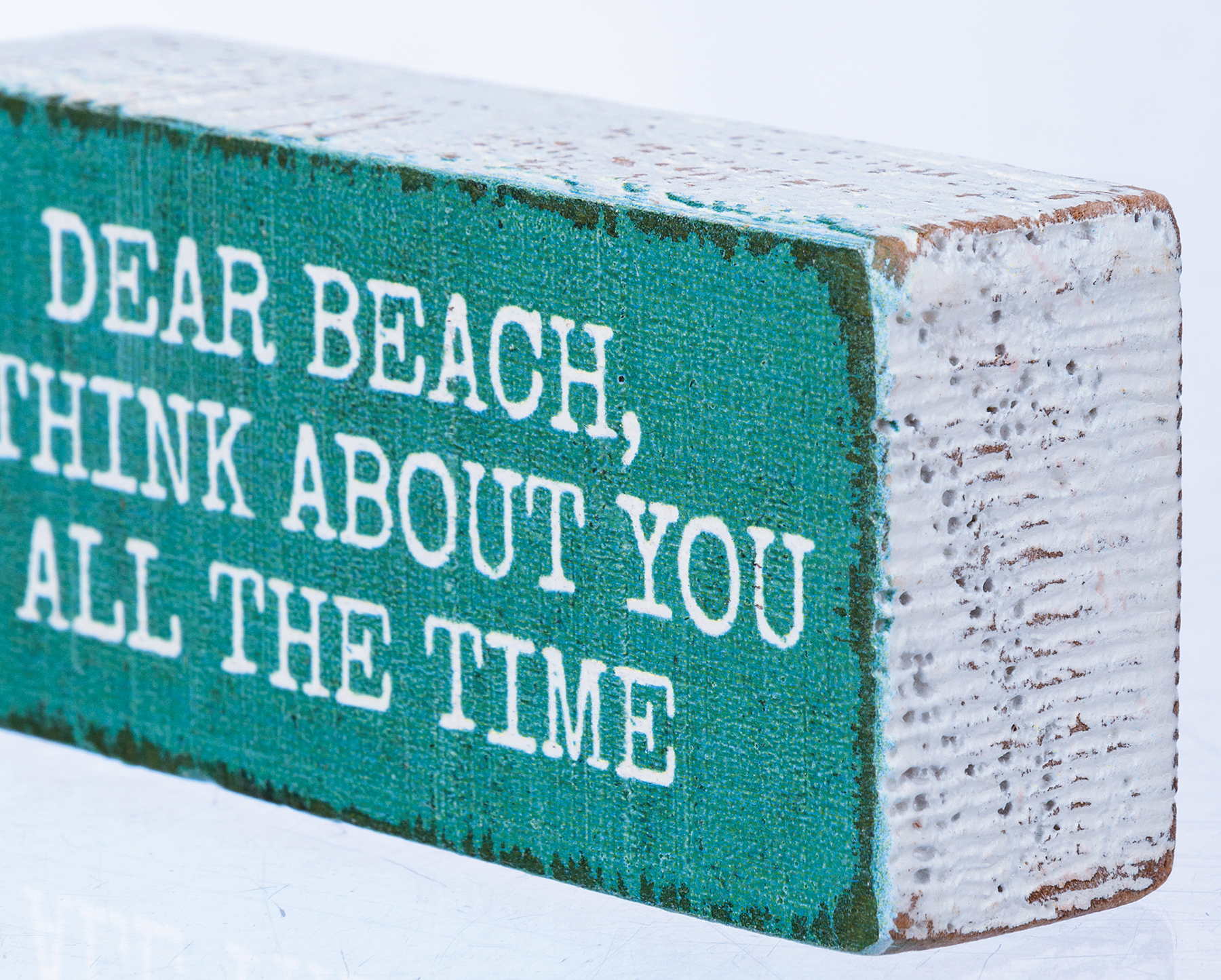 A wooden block sign featuring a "Dear Beach, I Think About You All The Time" sentiment in cream on an ocean blue background. design is replicated from original artwork painted onto burlap canvas, giving the art a unique depth and texture. Distressed white sides make the design pop. Easy to hang via predrilled keyhole slot or can free-stand alone.