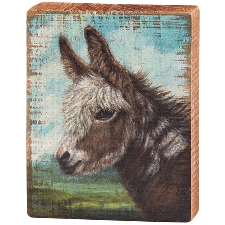 A wooden block sign from our Farmhouse Collection displaying a hand painted scene of a farm donkey in a field. Donkey design is replicated from original artwork painted onto burlap canvas, giving the art a unique depth and texture. Farm inspired block sign features distressed details with coordinating natural wood on the sides and back. Our Donkey block sign is easy to hang via predrilled keyhole slot or can free-stand alone. A rustic everyday home accent that can be easily displayed in any home or work space.