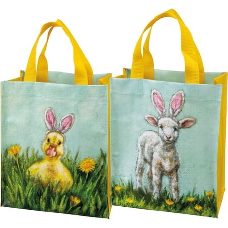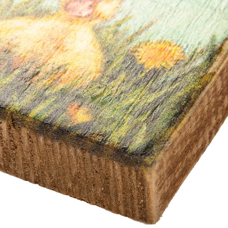 A wooden block sign featuring a duckling wearing bunny ears. Design is replicated from original artwork painted directly onto burlap canvas, giving a unique depth and texture to the art. Easy to hang via predrilled keyhole slot or can free-stand alone.