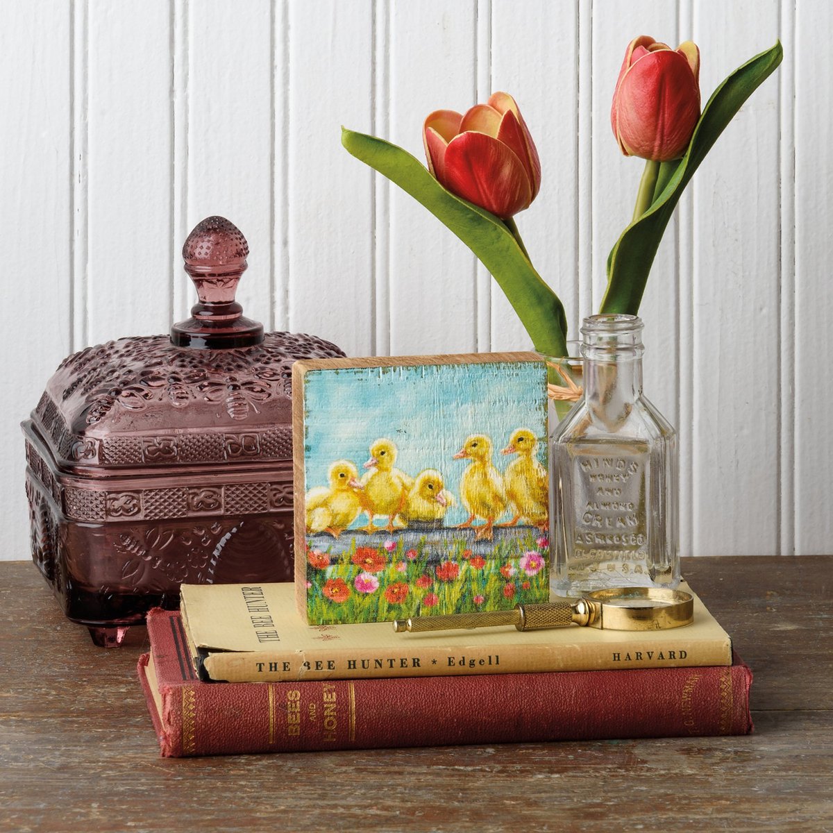 A wooden block sign from our Farmhouse Collection depicting five ducklings. Design is replicated from original artwork painted onto burlap canvas, giving the art a unique depth and texture. Our duckling sign is easy to hang via predrilled keyhole slot or can free-stand alone.
