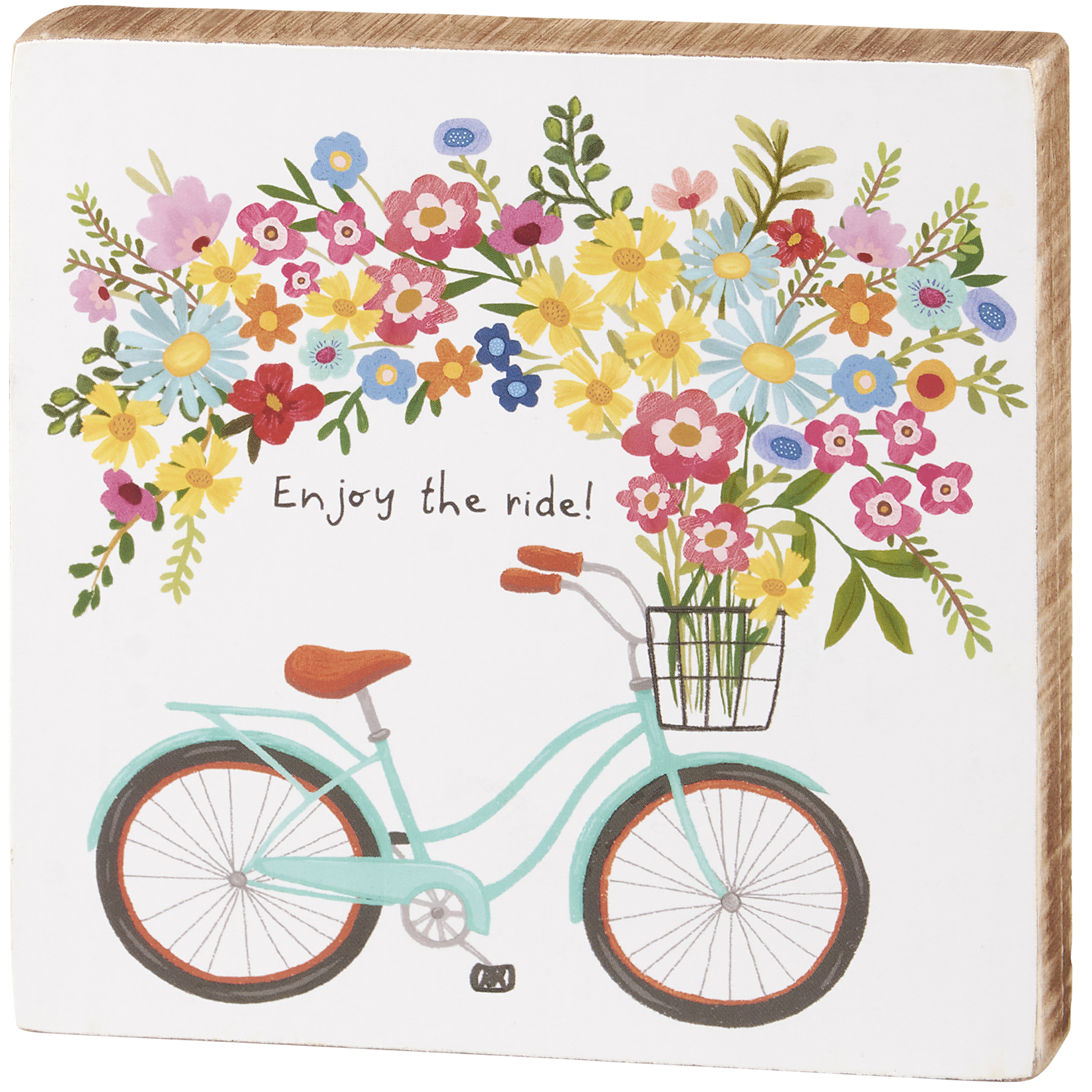 A colorful wooden block sign from our Inspiration & Blooms Collection displaying a hand illustrated design of a bike with vibrant flowers flowing out of the basket surrounding an inspirational sentiment that reads "Enjoy The Ride." Block sign features coordinating natural wood on the sides and back. Our Enjoy The Ride sign is easy to hang via predrilled keyhole slot or can free-stand alone. An inspirational everyday home accent great for gifting that can be easily displayed in any home or work space. Not eligible for discounting.