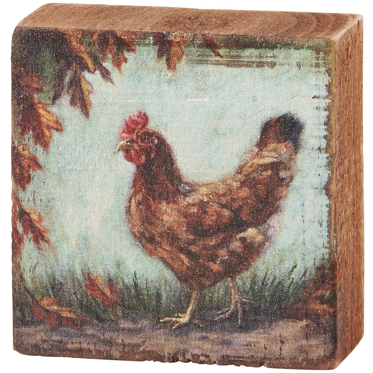 A wooden block sign from our Fall & Harvest Collection displaying a hand painted fall scene of a farm chicken. Design is replicated from original artwork painted onto burlap canvas, giving the art a unique depth and texture. Seasonal block sign features distressed details with coordinating natural wood on the sides and back. Our Fall Chicken sign is easy to hang via predrilled keyhole slot or can free-stand alone. A rustic seasonal home accent that can be easily displayed in any home or work space.