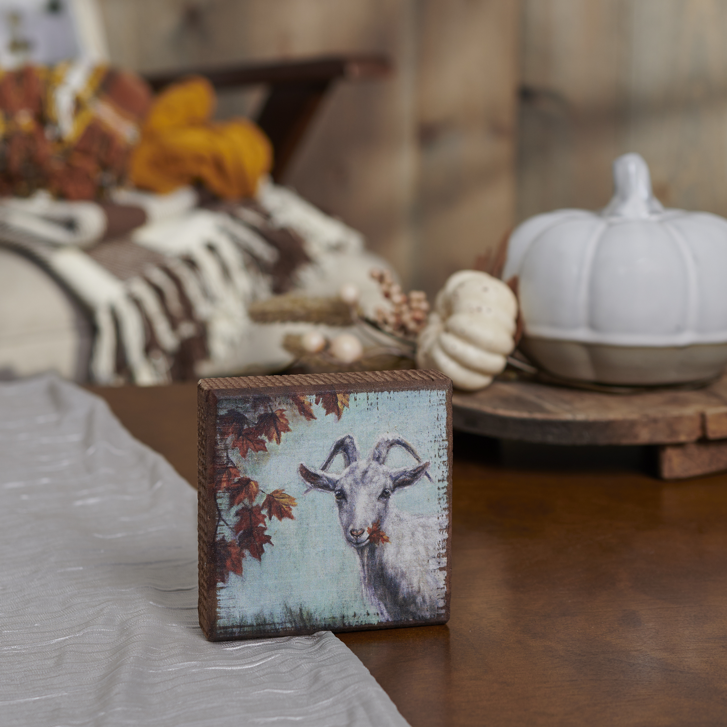 A wooden block sign from our Fall & Harvest Collection displaying a hand painted fall scene of a farm goat with an autumn leaf in its mouth. Design is replicated from original artwork painted onto burlap canvas, giving the art a unique depth and texture. Seasonal block sign features distressed details with coordinating natural wood on the sides and back. Our Fall Goat sign is easy to hang via predrilled keyhole slot or can free-stand alone. A rustic seasonal home accent that can be easily displayed in any home or work space.