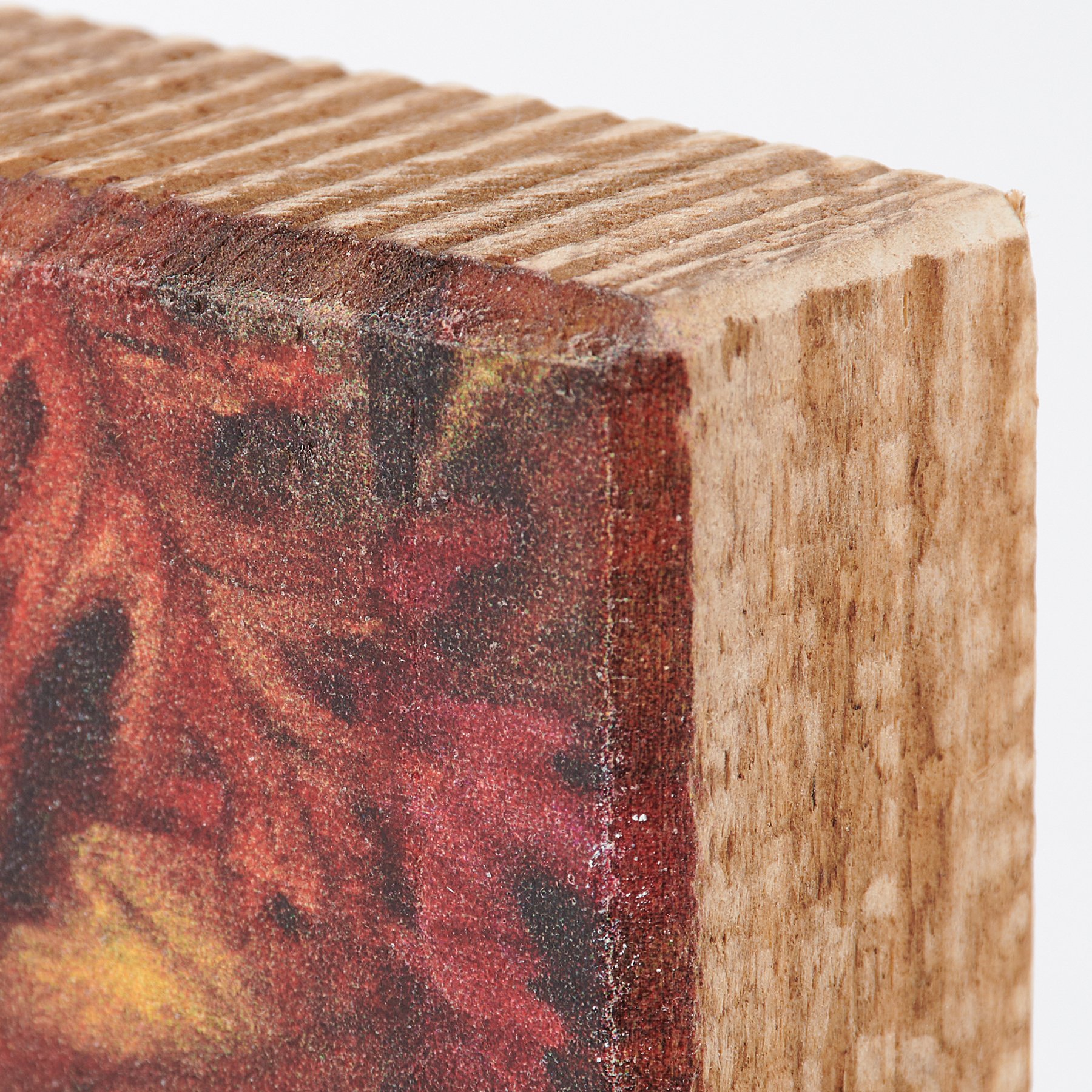 A wooden block sign from our Fall & Harvest Collection displaying a hand painted scene of a pile of autumn leaves. Design is replicated from original artwork painted onto burlap canvas, giving the art a unique depth and texture. Sides and back feature coordinating natural wood with distressed details. Our Fall Leaves block sign is easy to hang via predrilled keyhole slot or can free-stand alone. A charming seasonal home accent with a variety of display options.