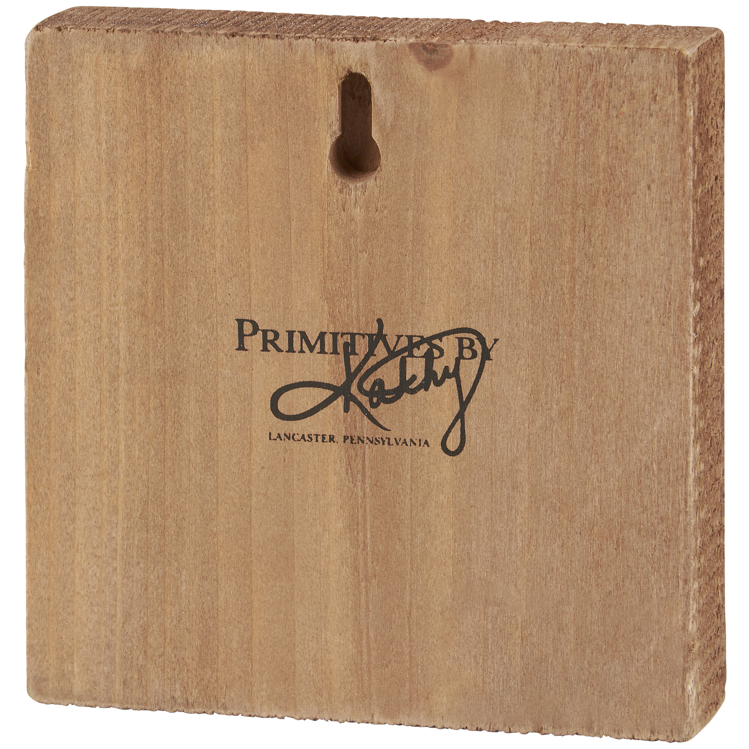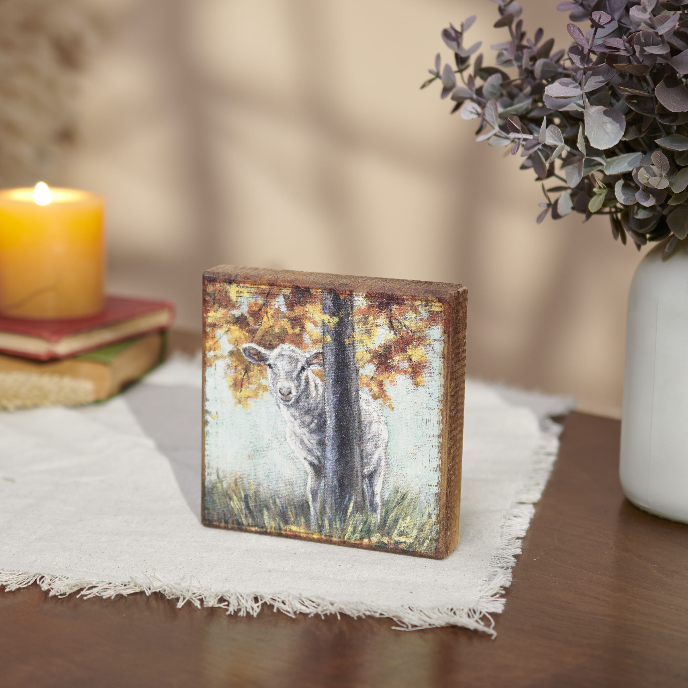 A wooden block sign from our Fall & Harvest Collection displaying a hand painted fall scene of a sheep peeking from behind a tree. Design is replicated from original artwork painted onto burlap canvas, giving the art a unique depth and texture. Seasonal block sign features distressed details with coordinating natural wood on the sides and back. Our Fall Sheep sign is easy to hang via predrilled keyhole slot or can free-stand alone. A rustic seasonal home accent that can be easily displayed in any home or work space.