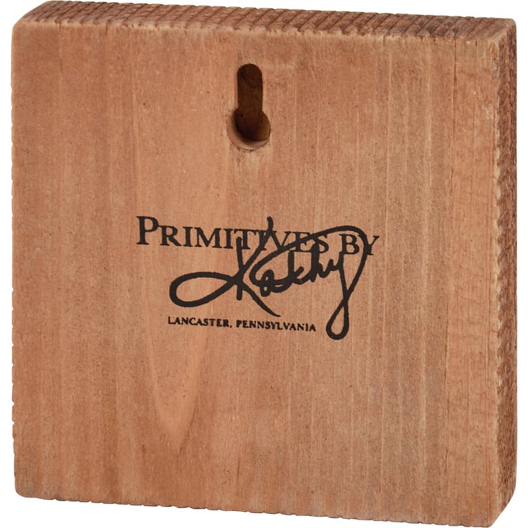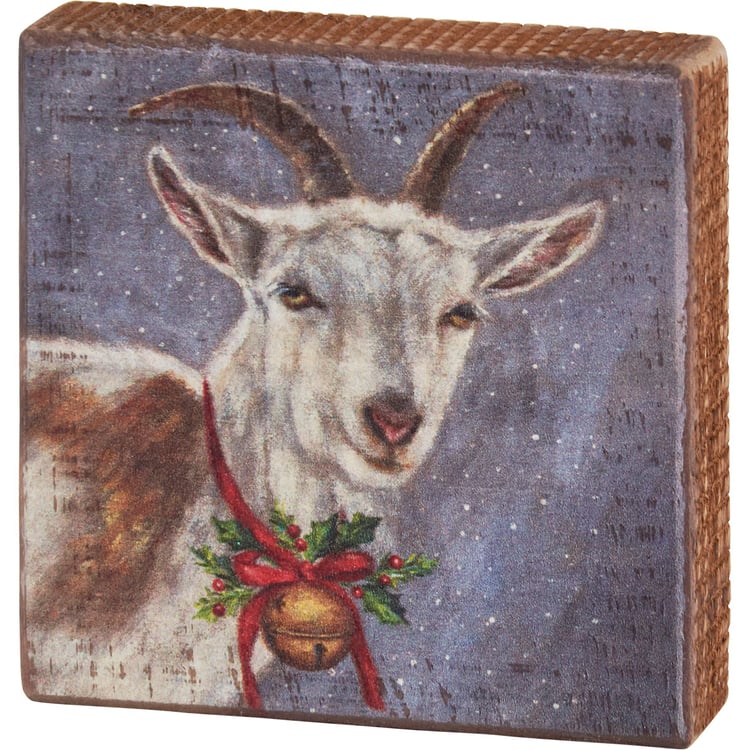 A wooden block sign from our Christmas Collection displaying a calming hand painted scene of a goat in the snow wearing a Christmas bell. Design is replicated from original artwork painted onto burlap canvas, giving the art a unique depth and texture. Sides and back feature coordinating natural wood with distressed details. Our Festive Goat block sign is easy to hang via predrilled keyhole slot or can free-stand alone. A charming seasonal home accent with a variety of display options.