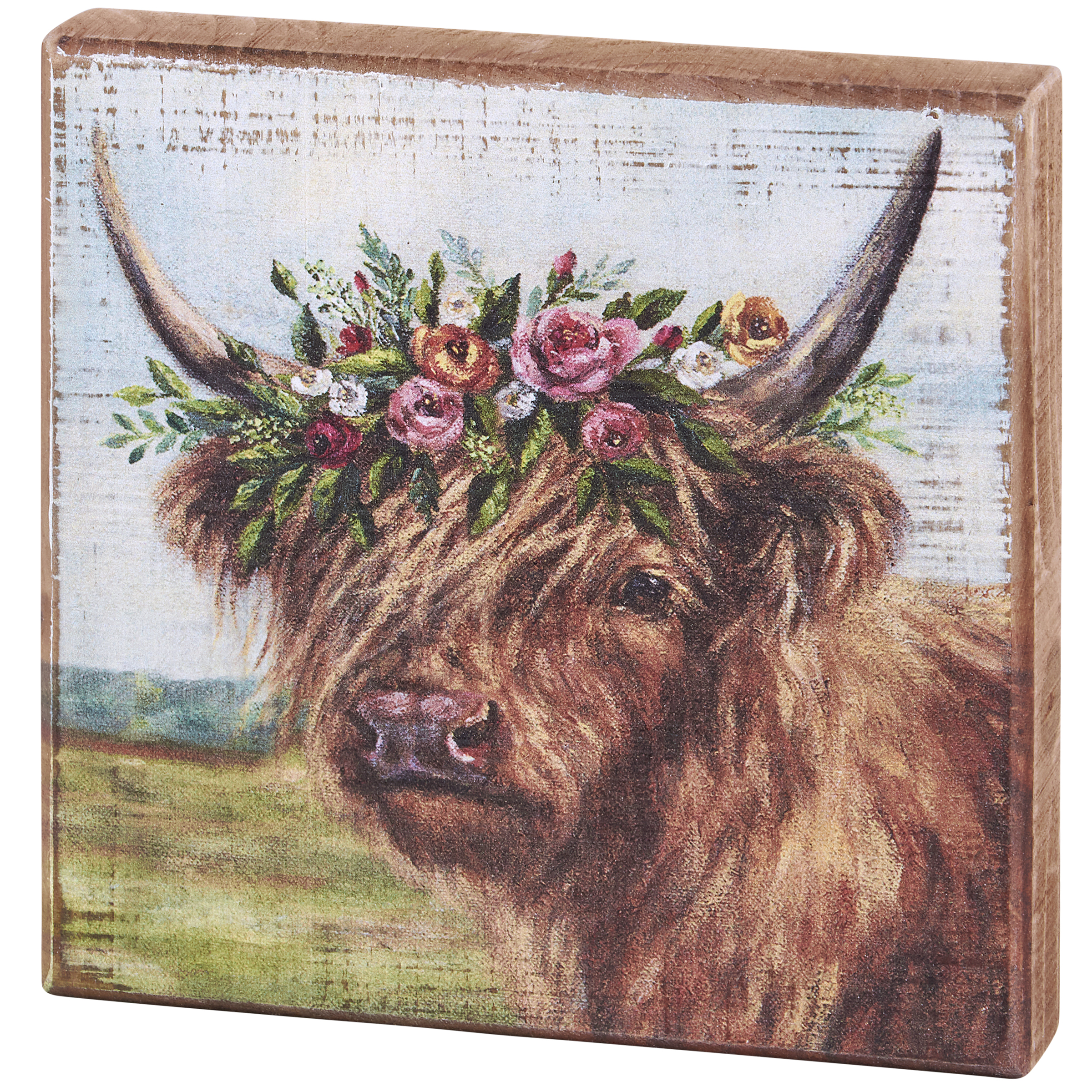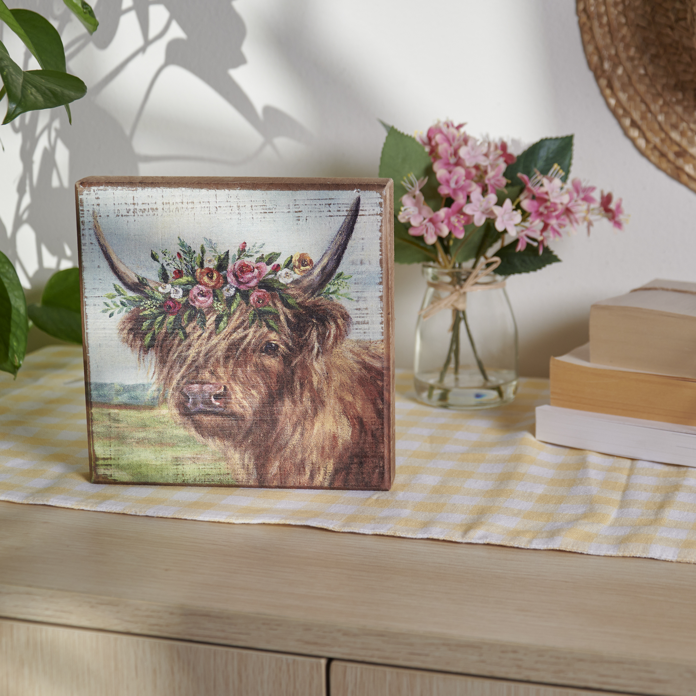 A charming wooden block sign from our Farmhouse Collection displaying a calming scene of a highland cow wearing a spring floral crown in an open field. Design is replicated from original artwork painted onto burlap canvas, giving the art a unique depth and texture. Block sign features distressed details with coordinating natural wood on the sides and back. Our Floral Highland block sign is easy to hang via predrilled keyhole slot or can free-stand alone. A rustic everyday home accent with a variety of display options.
