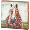 A charming wooden block sign from our Farmhouse Collection displaying a calming scene of a pony wearing a spring floral wreath in an open field. Design is replicated from original artwork painted onto burlap canvas, giving the art a unique depth and texture. Block sign features distressed details with coordinating natural wood on the sides and back. Our Floral Pony block sign is easy to hang via predrilled keyhole slot or can free-stand alone. A rustic everyday home accent with a variety of display options. Not eligible for discounting.