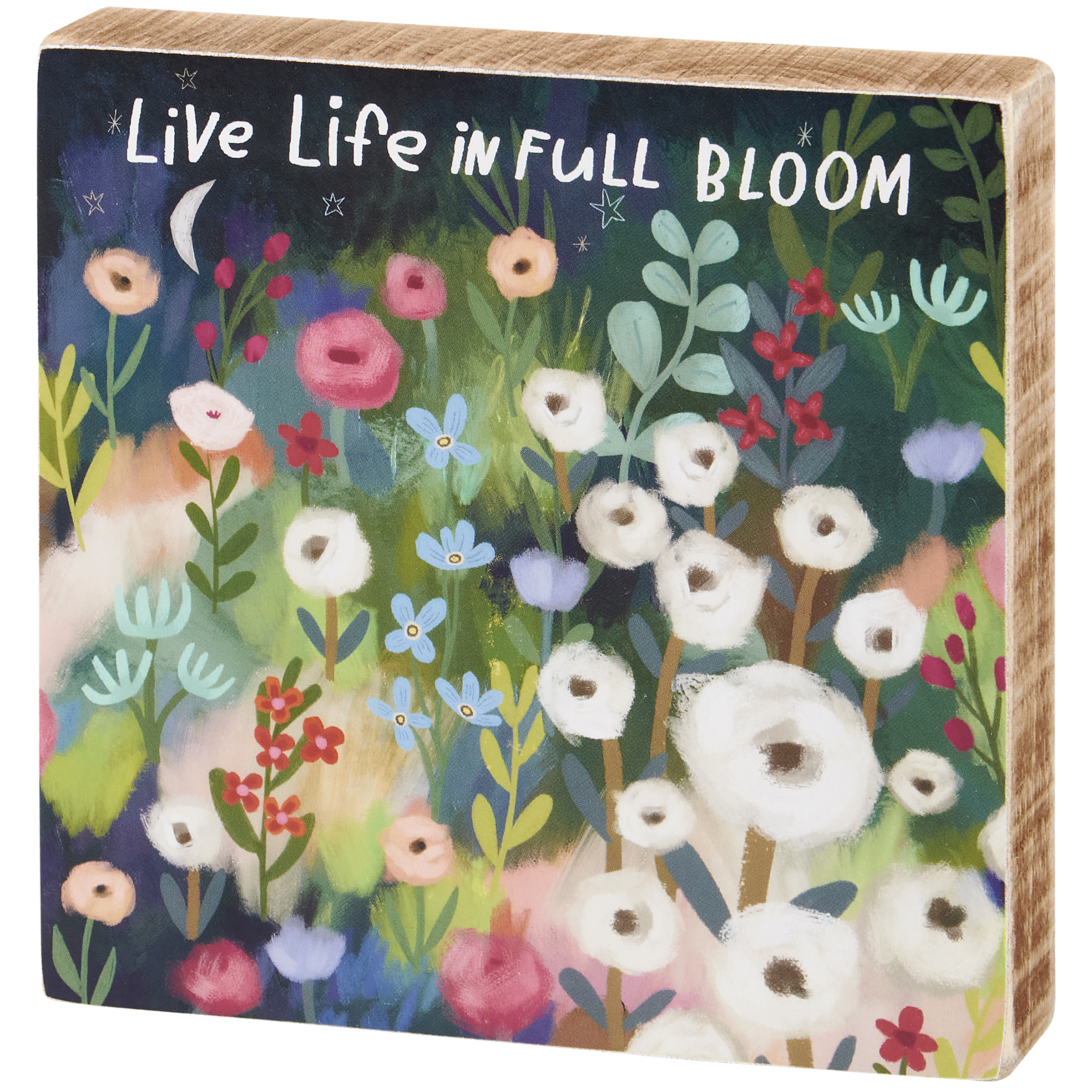 A colorful wooden block sign from our Inspiration & Blooms Collection displaying a hand illustrated design of a night sky and vibrant florals with an inspirational sentiment that reads "Live Life In Full Bloom." Block sign features coordinating natural wood on the sides and back. Our Full Bloom sign is easy to hang via predrilled keyhole slot or can free-stand alone. An inspirational everyday home accent great for gifting that can be easily displayed in any home or work space.