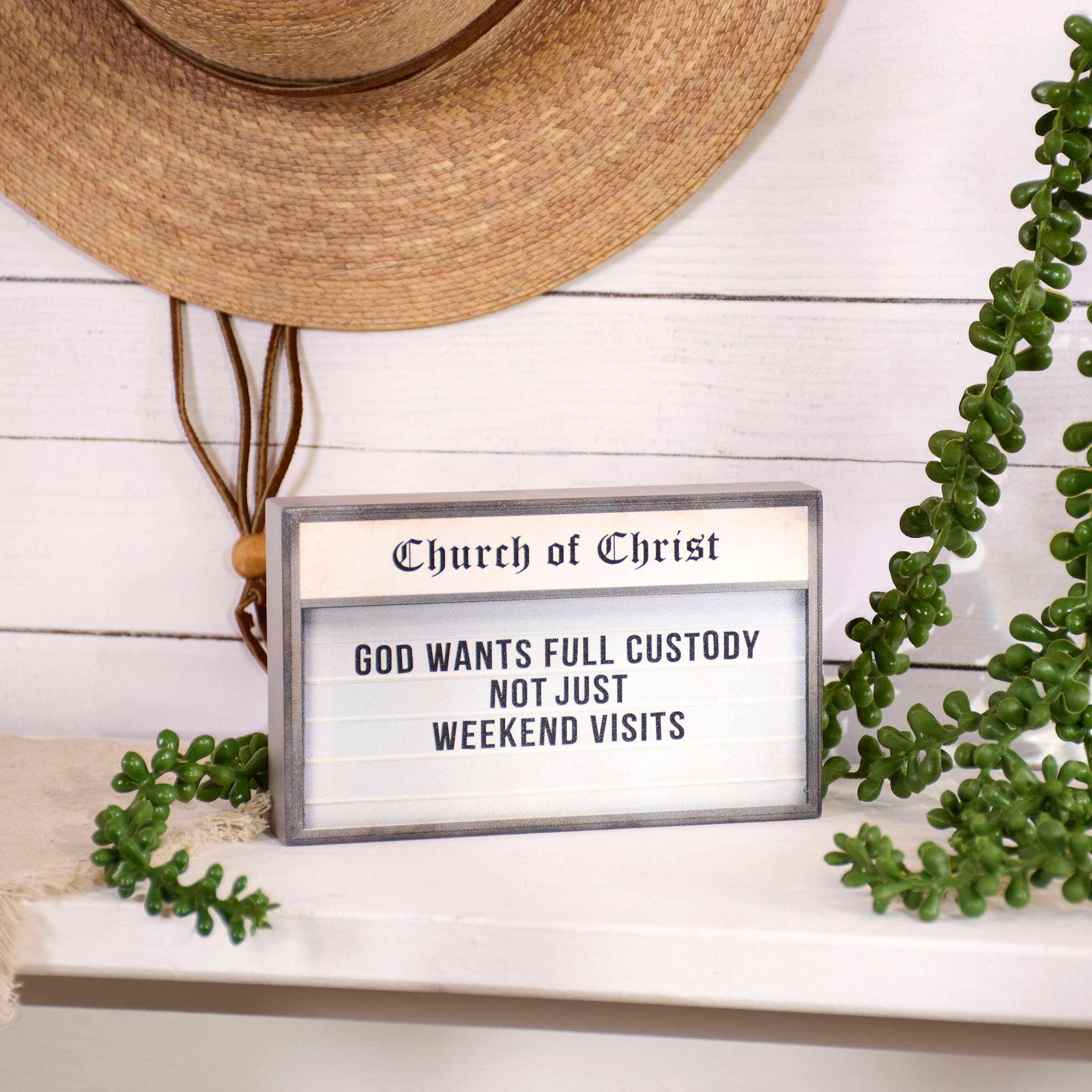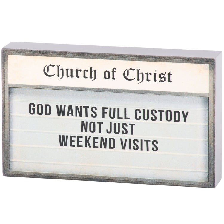 A wooden block sign from our Faith Collection displaying a church sign inspired design with a funny faith sentiment that reads "God Wants Full Custody - Not Just Weekend Visits." Church sign features coordinating gray color on the sides and back. Our God Wants Full Custody sign is easy to hang via predrilled keyhole slot or can free-stand on flat surface for display. A fun faith-themed home accent that can be easily displayed in any home or work space.
