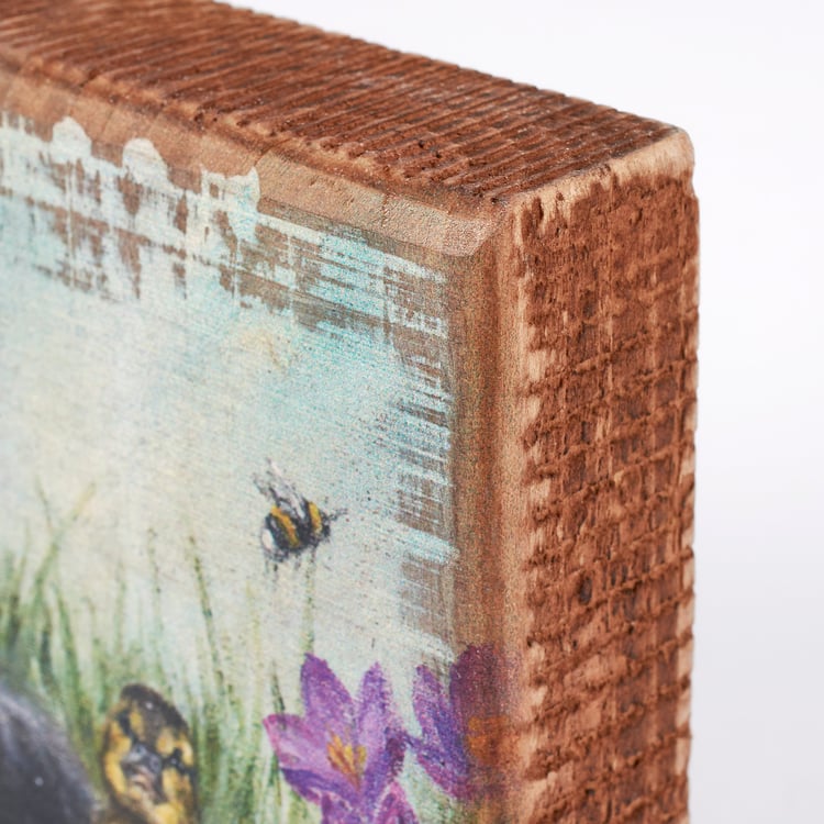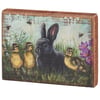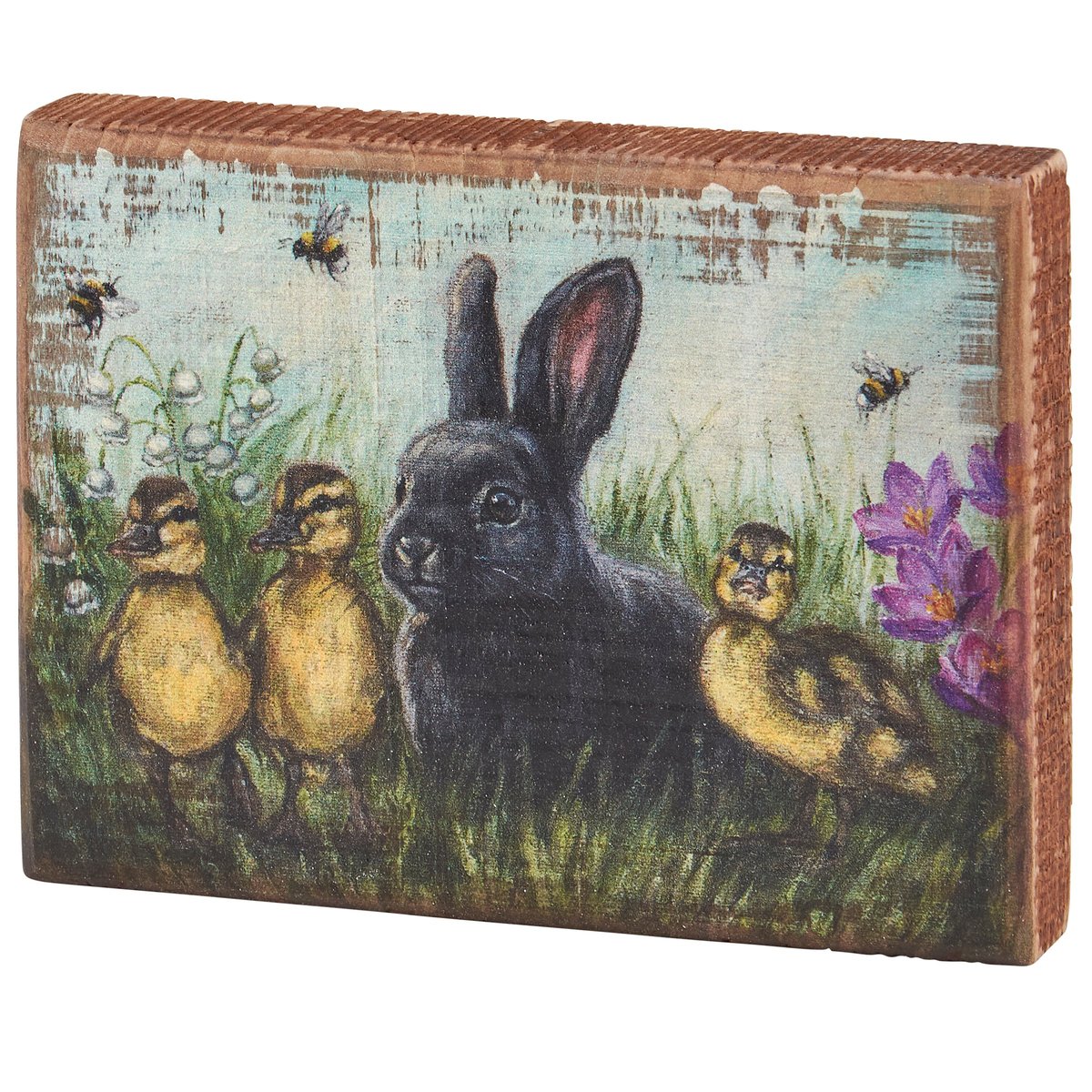 A wooden block sign from our Easter & Spring Collection displaying a charming scene of a black bunny and ducklings in tall grass with spring flowers. Design is replicated from original artwork painted onto burlap canvas, giving the art a unique depth and texture. Block sign features distressed details with coordinating natural wood on the sides and back. Our Garden Friends block sign is easy to hang via predrilled keyhole slot or can free-stand alone. A rustic seasonal home accent great for gifting that can be easily displayed in any home or work space.