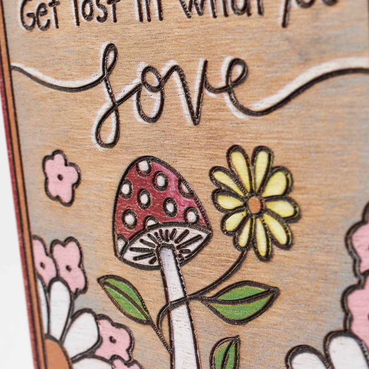 A wooden block sign from our Valentine's Day Collection displaying a unique hand illustrated design of a flower wrapped around a mushroom under a heartwarming sentiment that reads "Get Lost In What You Love." Love-themed block sign features wood burned details for added texture with coordinating blue color on the sides and natural wood on the back. Our Get Lost In What You Love block sign is easy to hang via predrilled keyhole slot or can free-stand alone. A love-themed home accent great for gifting that can be easily displayed in any home or work space.