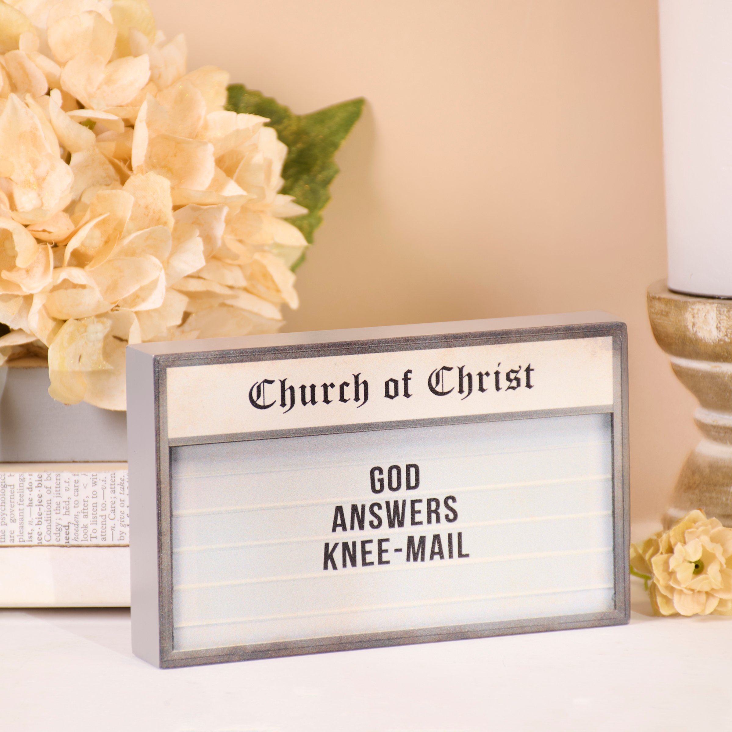 A wooden block sign from our Faith Collection displaying a church sign inspired design with a funny faith sentiment that reads "God Answers Knee-Mail." Church sign features coordinating gray color on the sides and back. Our God Answers Knee-Mail sign is easy to hang via predrilled keyhole slot or can free-stand on flat surface for display. A fun faith-themed home accent that can be easily displayed in any home or work space.