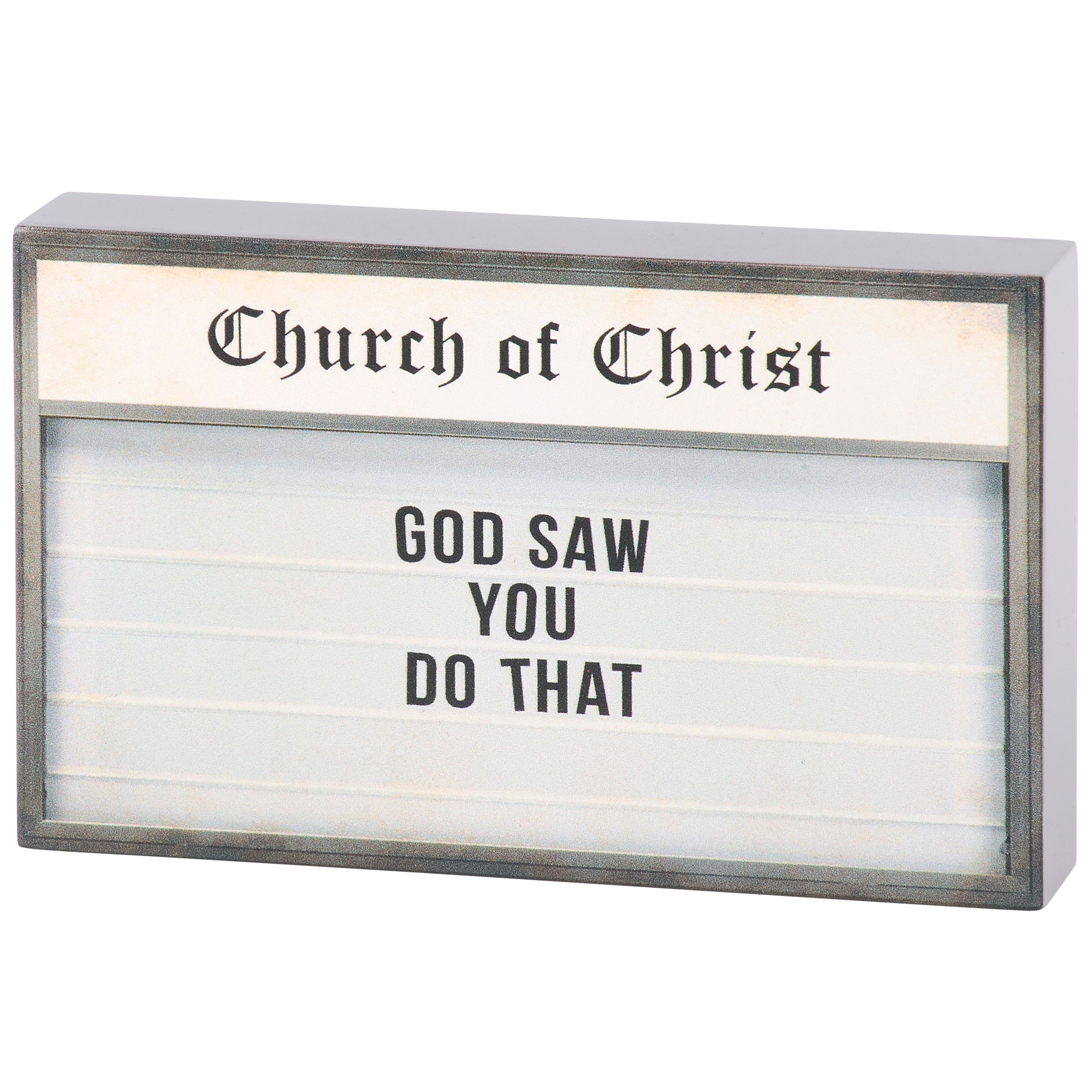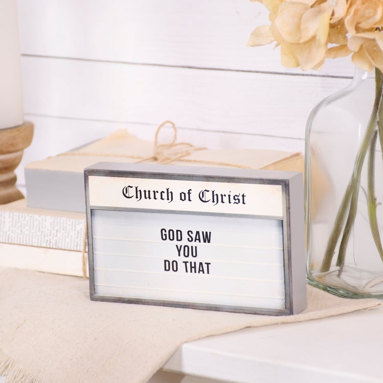A wooden block sign from our Faith Collection displaying a church sign inspired design with a funny faith sentiment that reads "God Saw You Do That." Church sign features coordinating gray color on the sides and back. Our God Saw You Do That sign is easy to hang via predrilled keyhole slot or can free-stand on flat surface for display. A fun faith-themed home accent that can be easily displayed in any home or work space.