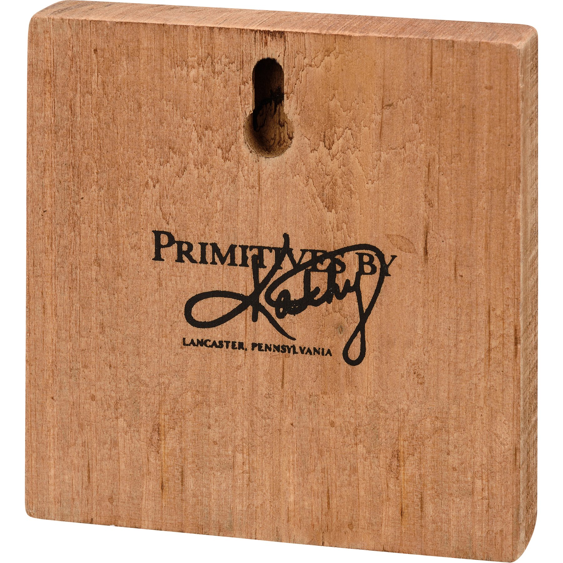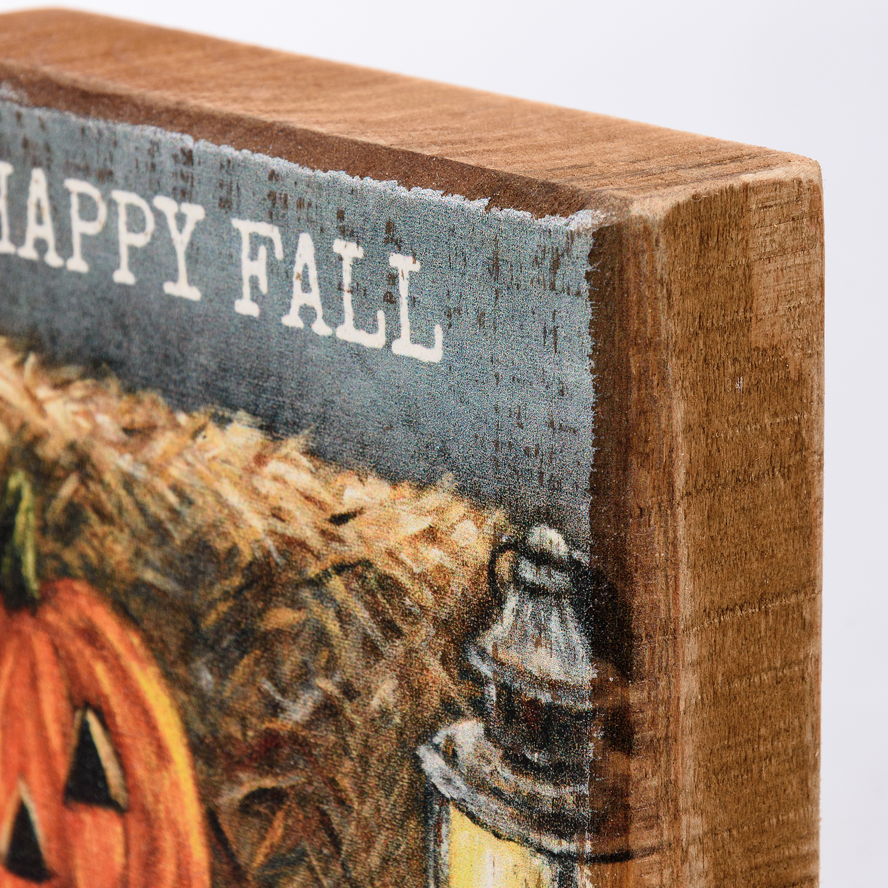 A wooden block sign featuring a Jack-O'-Lantern design with "Happy Fall" sentiment. Design is replicated from original artwork painted onto burlap canvas, giving the art a unique depth and texture. Easy to hang via predrilled keyhole slot or can free-stand alone.