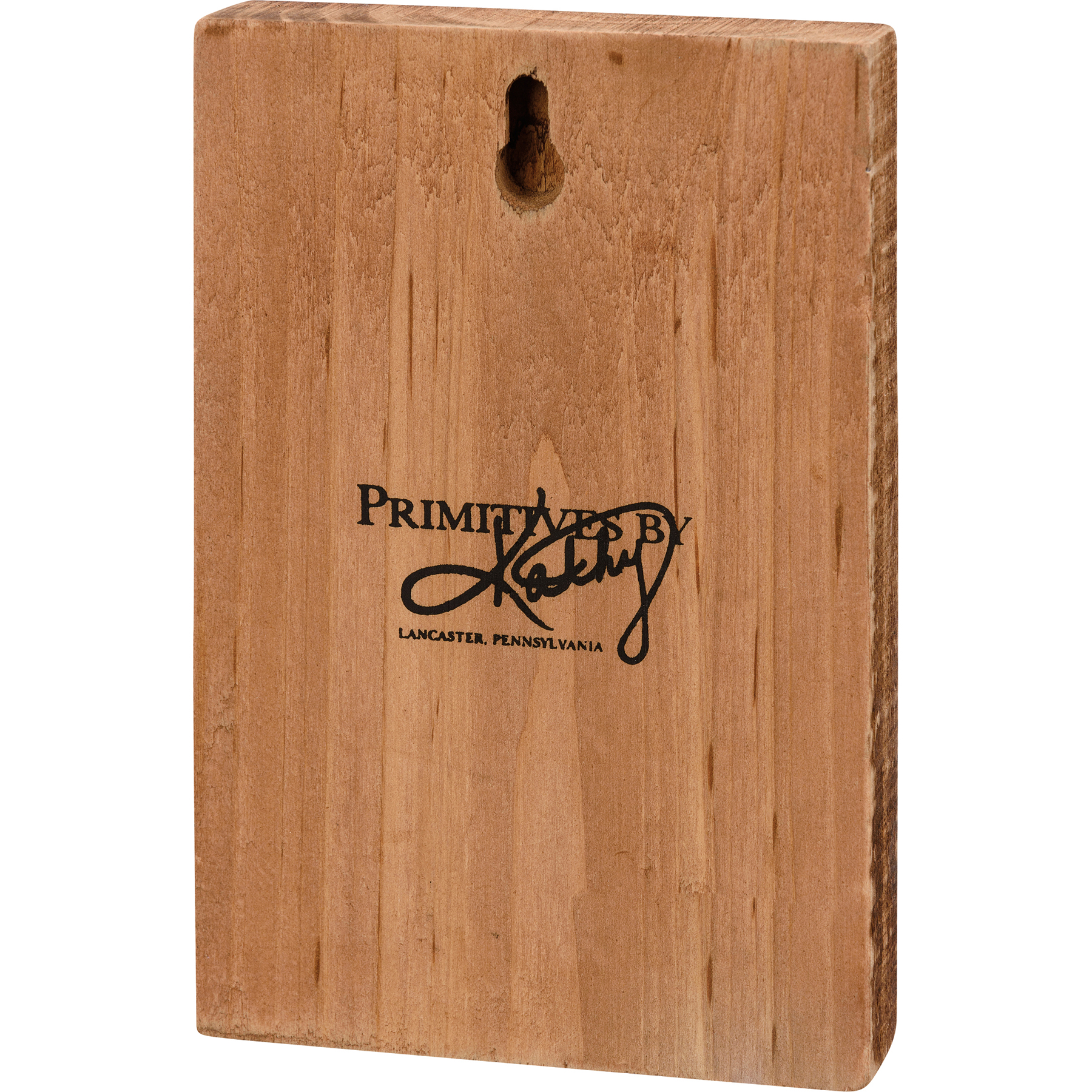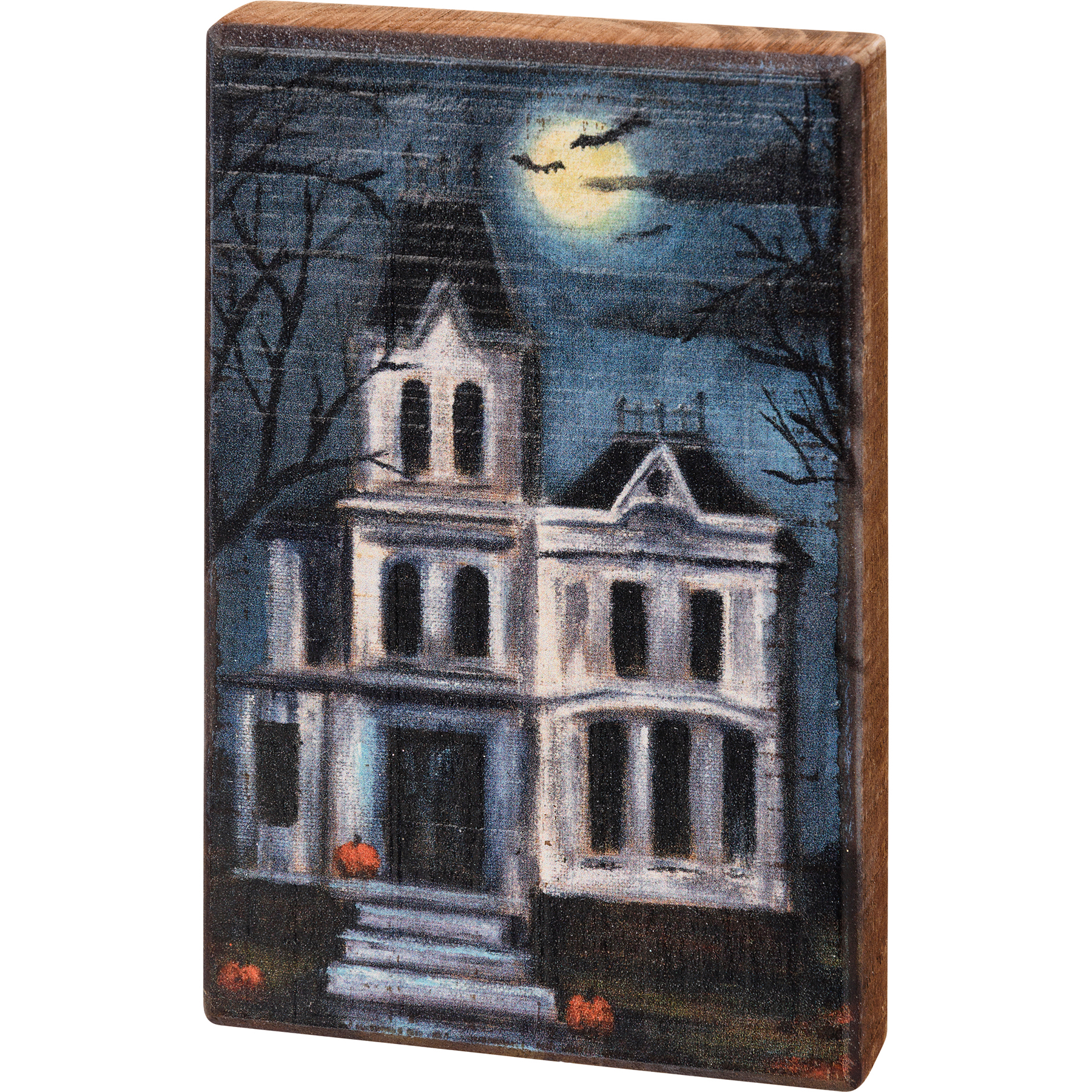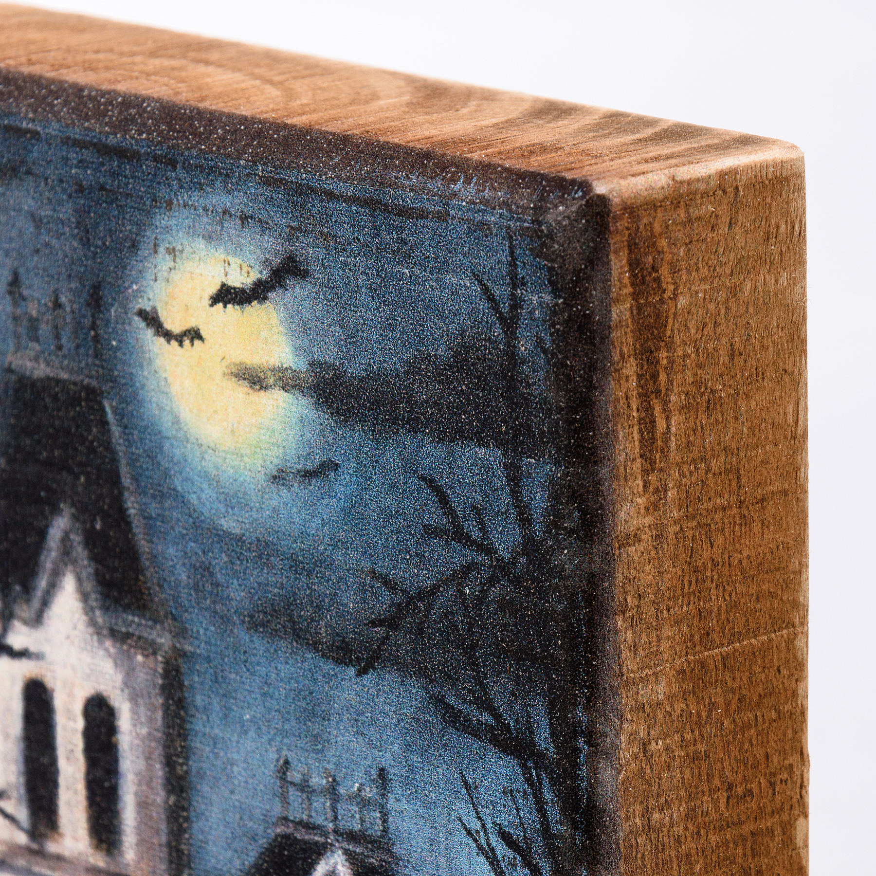 A wooden block sign depicting a haunted house for Halloween and a spooky color palette. Design is replicated from original artwork painted onto burlap canvas, giving the art a unique depth and texture. Easy to hang via predrilled keyhole slot or can free-stand alone.