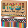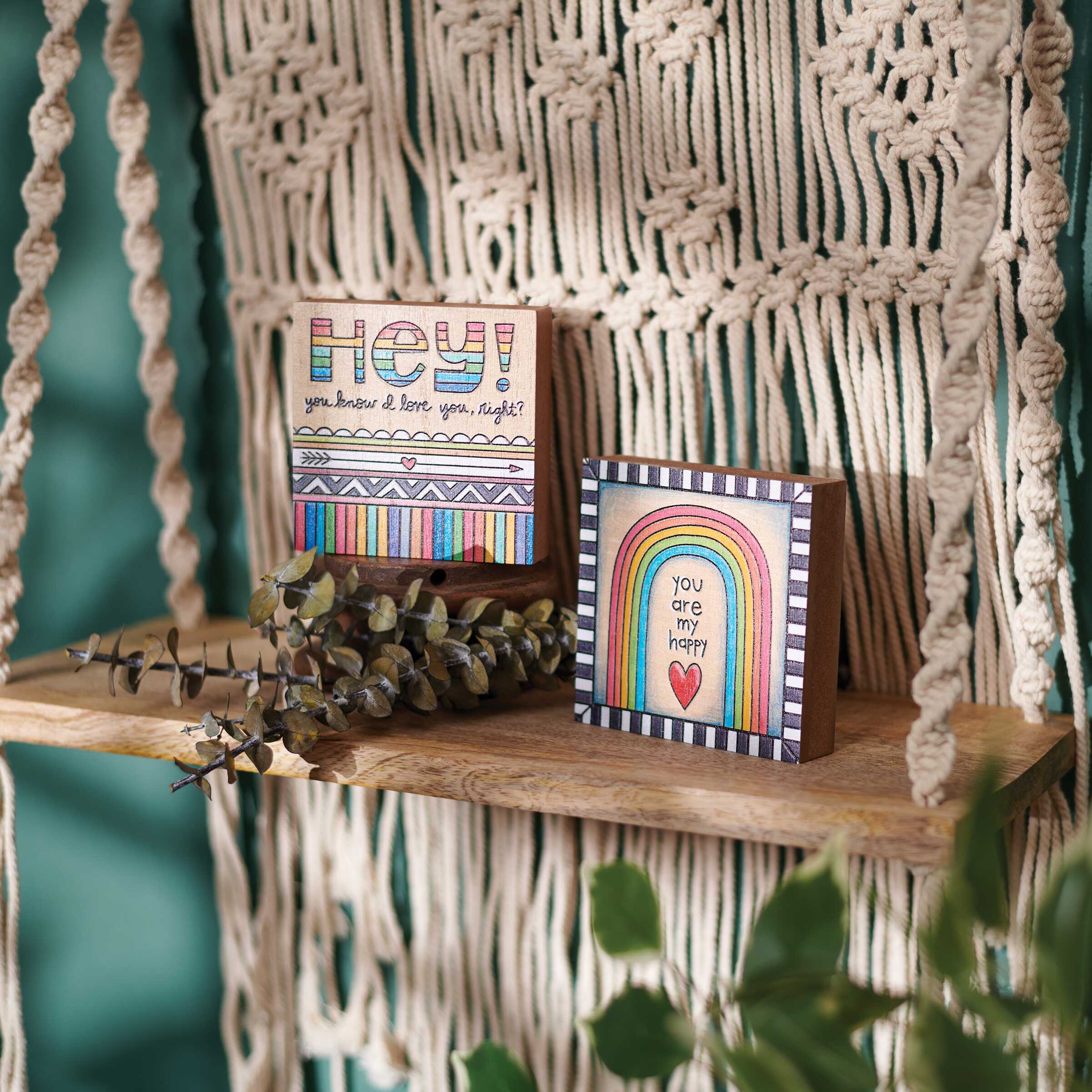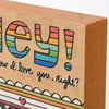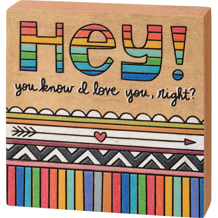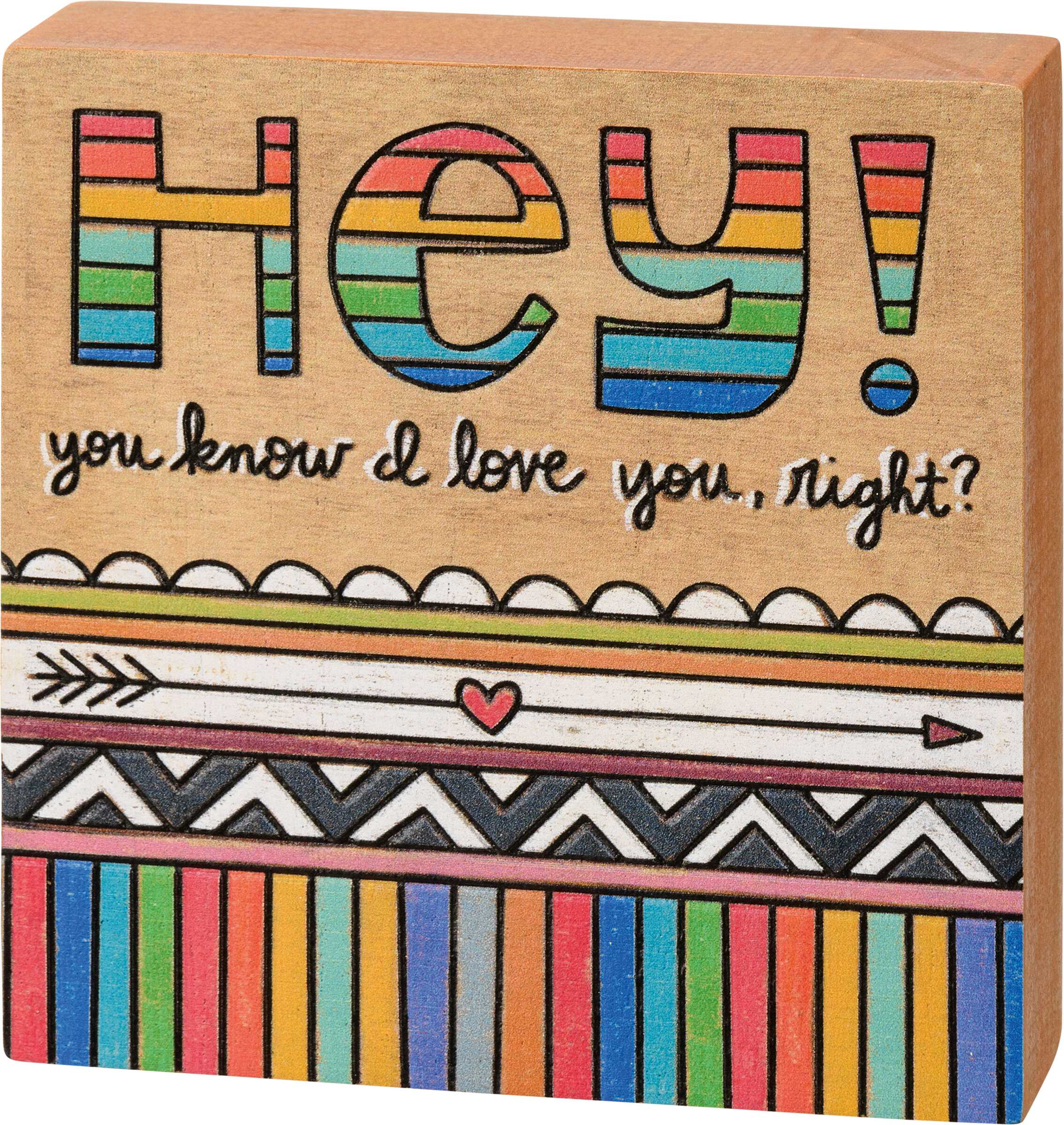 A wooden block sign from our Wood Burned Collection featuring "Hey You Know I Love You Right" sentiment, natural wood sides for added interest, and colorful woodburned designs. Our You Know I Love You sign is easy to hang via predrilled keyhole slot or can free-stand alone.