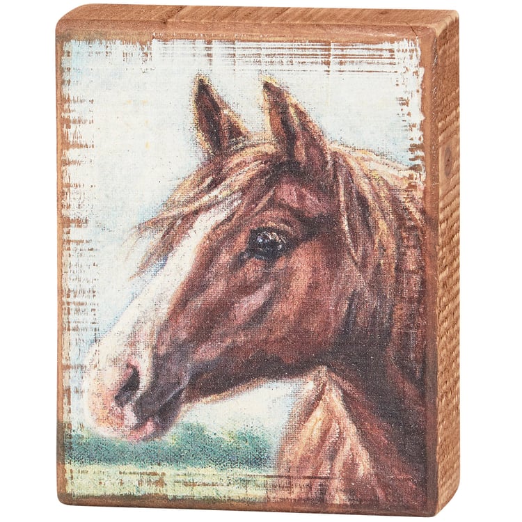 A charming wooden block sign from our Farmhouse Collection displaying a calming hand painted design of a horse in a field. Design is replicated from original artwork painted onto burlap canvas, giving the art a unique depth and texture. Block sign features distressed details with coordinating natural wood sides and back. Our Horse sign is easy to hang via predrilled keyhole slot or can free-stand alone. A rustic everyday home accent that can be easily displayed in any home or work space.