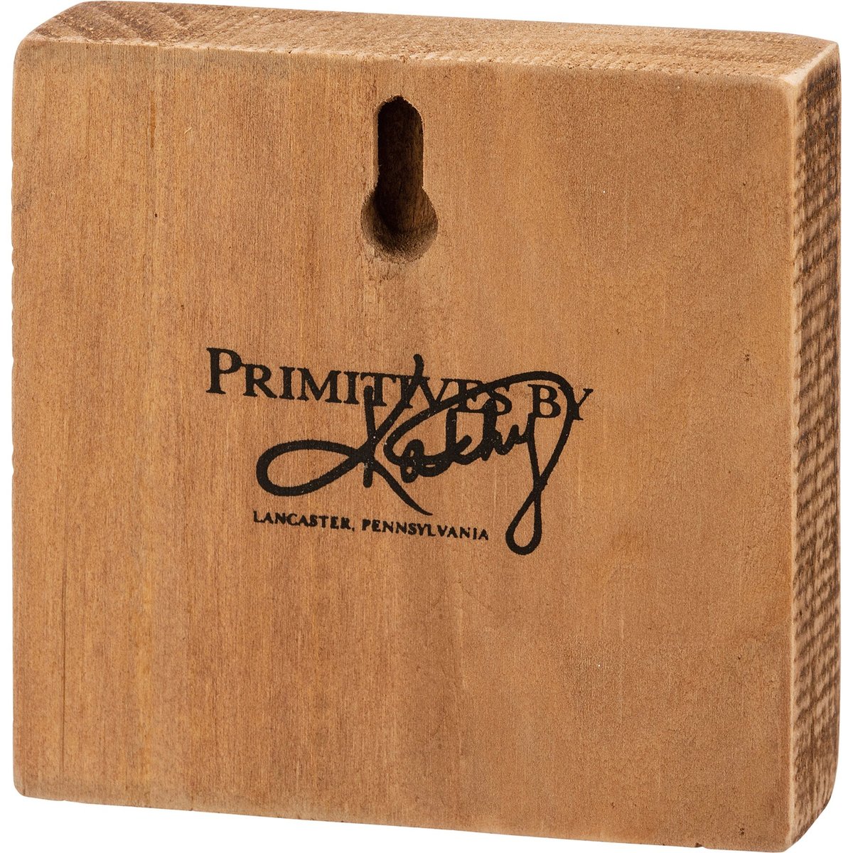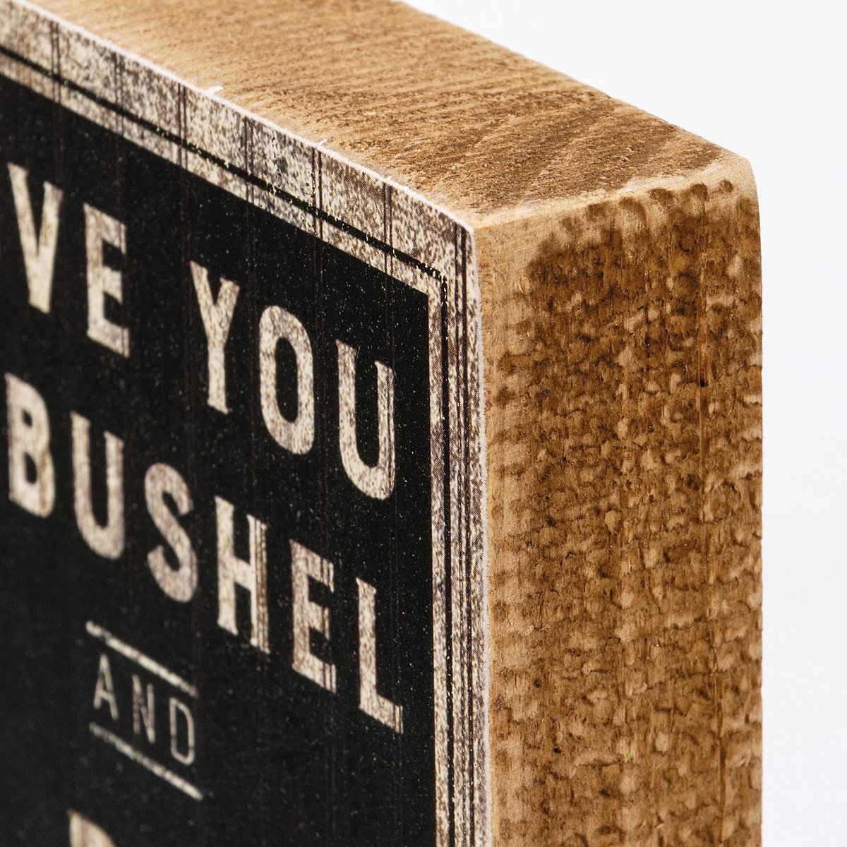 A wooden block sign featuring "Love You A Bushel And A Peck" sentiment. Natural wood sides, slat accents, and distressed details make the design pop. Wooden wall art is easy to hang via predrilled keyhole slot or can free-stand alone.