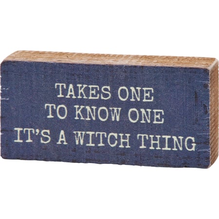 A wooden block sign from our Halloween Collection displaying a hand painted "Takes One To Know One - It's A Witch Thing" sentiment on spooky blue background. Design is replicated from original artwork painted onto burlap canvas, giving the art a unique depth and texture. Sides and back feature coordinating natural wood with distressed details. Our It's A Witch Thing block sign is easy to hang via predrilled keyhole slot or can free-stand alone. A fun seasonal home accent with a variety of display options.