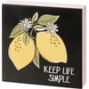 A wooden block sign from our Garden Collection featuring a hand lettered "Keep Life Simple" sentiment with whimsical lemon designs on a black base. Sides feature contrasting pink color for added interest. Our Keep Life Simple sign is easy to hang via predrilled keyhole slot or can free-stand alone.