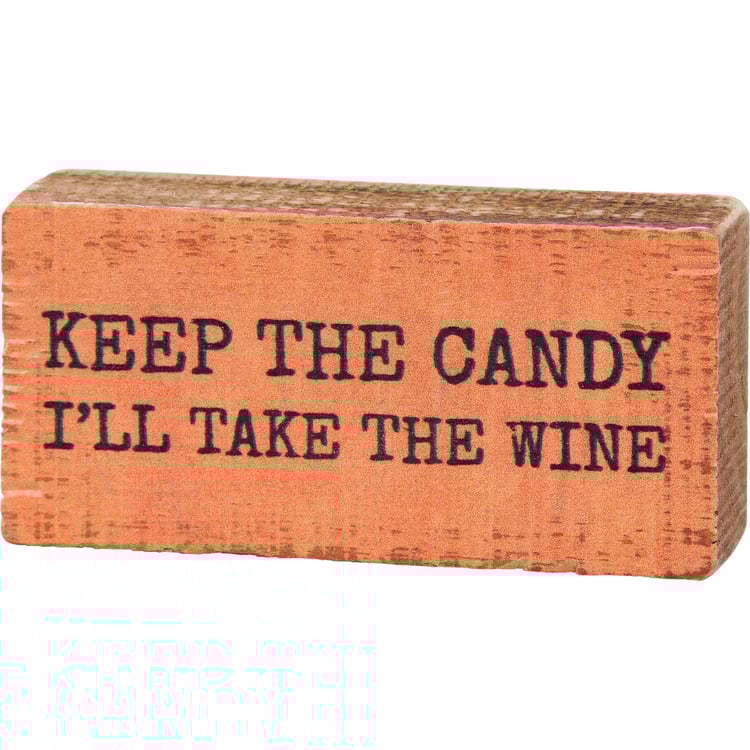 A wooden block sign from our Halloween Collection displaying a humorous "Keep The Candy - I'll Take The Wine" sentiment on orange background. Design is replicated from original artwork painted onto burlap canvas, giving the art a unique depth and texture. Sides and back feature coordinating natural wood with distressed details. Our Keep The Candy block sign is easy to hang via predrilled keyhole slot or can free-stand alone. A fun seasonal home accent with a variety of display options.