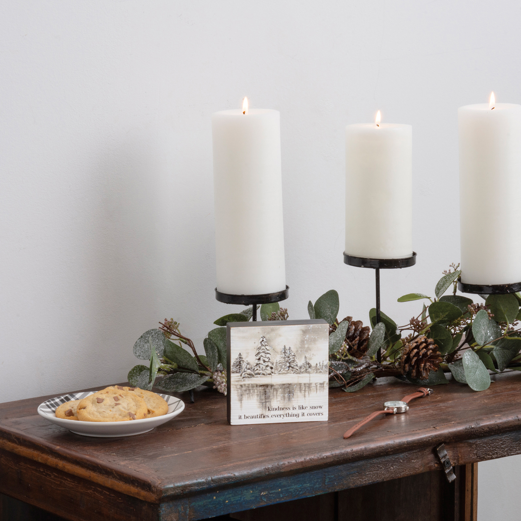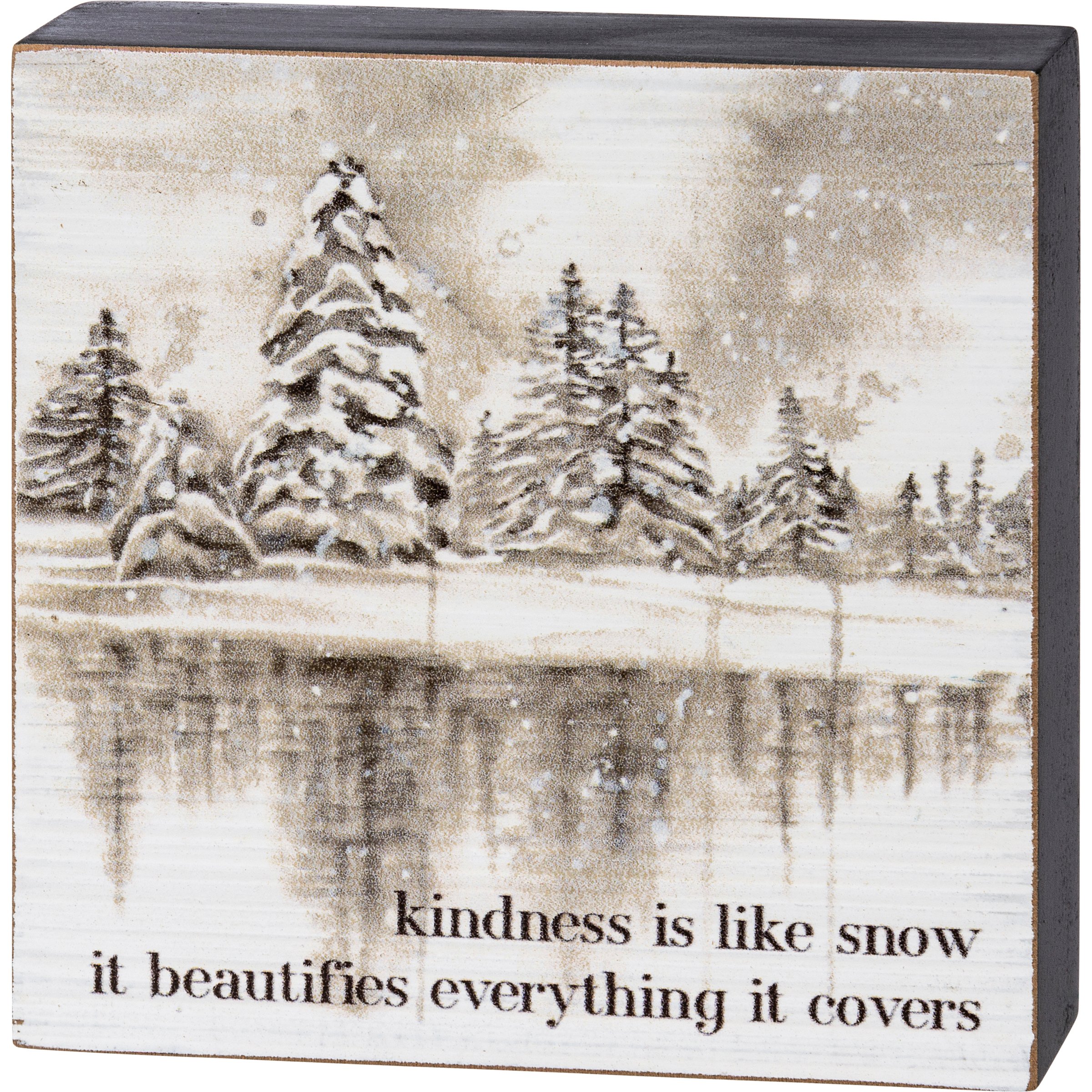 A wooden block sign featuring "Kindness Is Like Snow Because It Beautifies Everything It Covers" sentiment and snow covered trees design. Easy to hang or can free-stand alone.