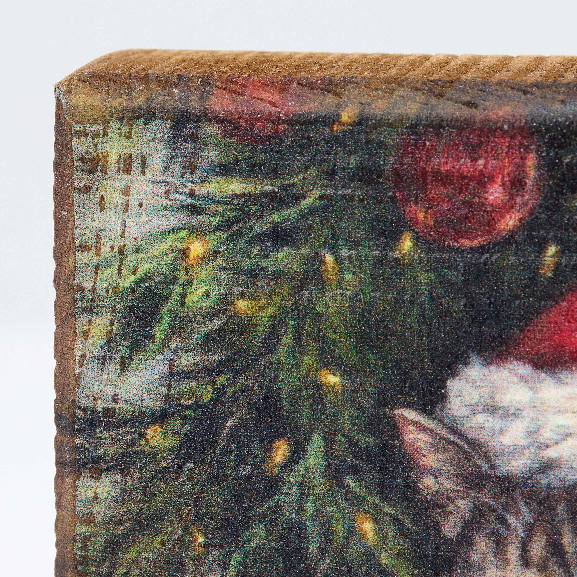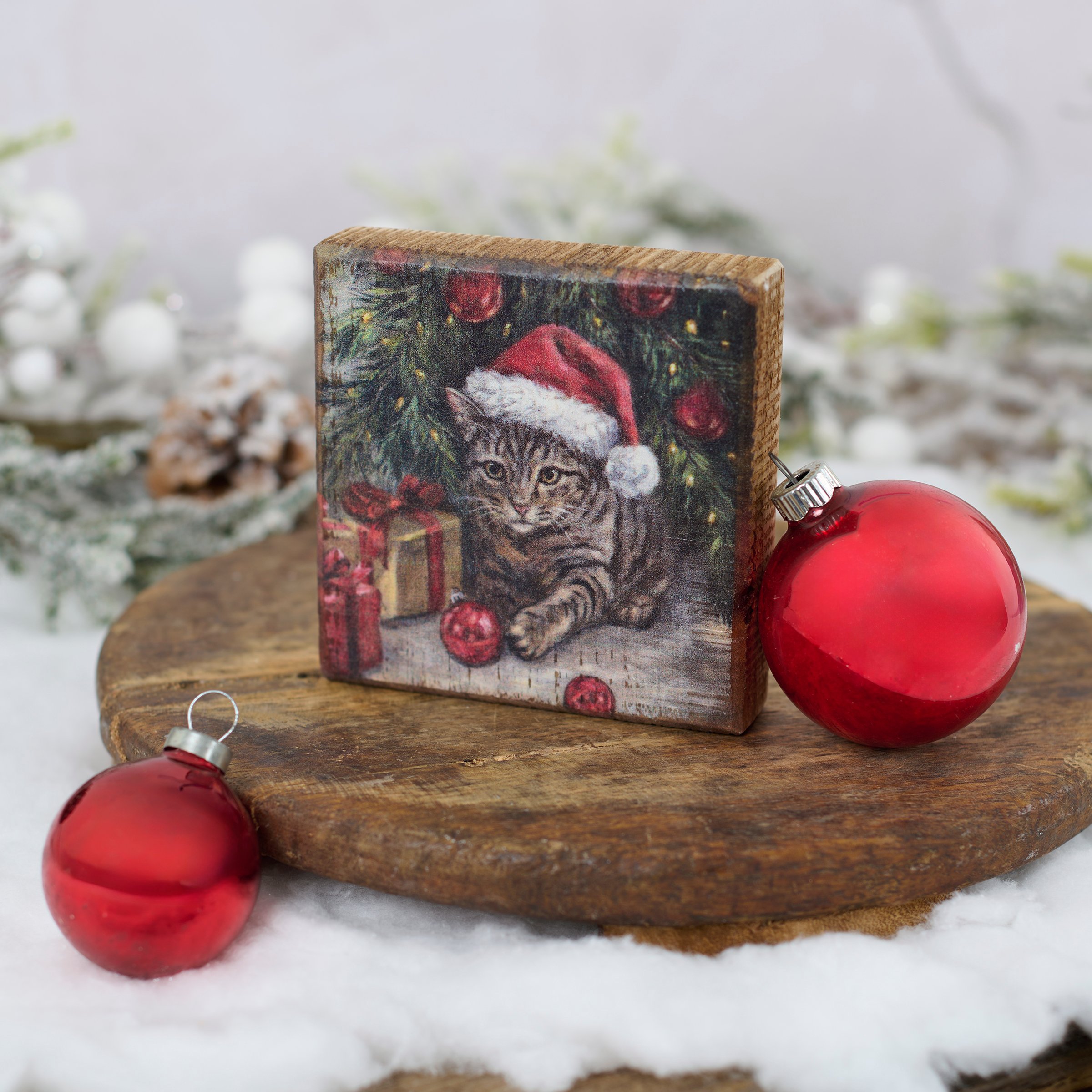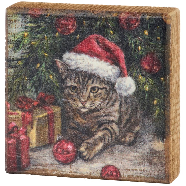 A wooden block sign from our Holiday Pet Collection displaying a charming scene of a kitty wearing a Santa hat under a Christmas tree getting into mischief by knocking down ornaments. Christmas kitty design is replicated from original artwork painted onto burlap canvas, giving the art a unique depth and texture. This seasonal block sign features distressed details with coordinating natural wood on the sides and back. Our Kitty Mischief sign is easy to hang via a predrilled keyhole slot on the back or can free-stand on a flat surface for display. A cute cat-themed Christmas gift that can be easily displayed in any home or work space.