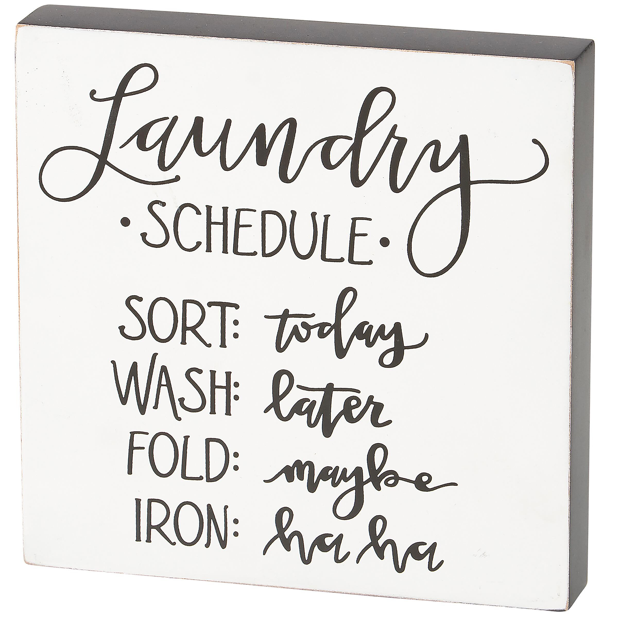 A wooden block sign from our Box Sign Style Collection featuring a "Laundry Schedule " sentiment . Our Laundry Schedule sign is easy to hang via predrilled keyhole slot or can free-stand alone a shelf or mantel. Complements well with coordinating design pieces. Not eligible for discounting.