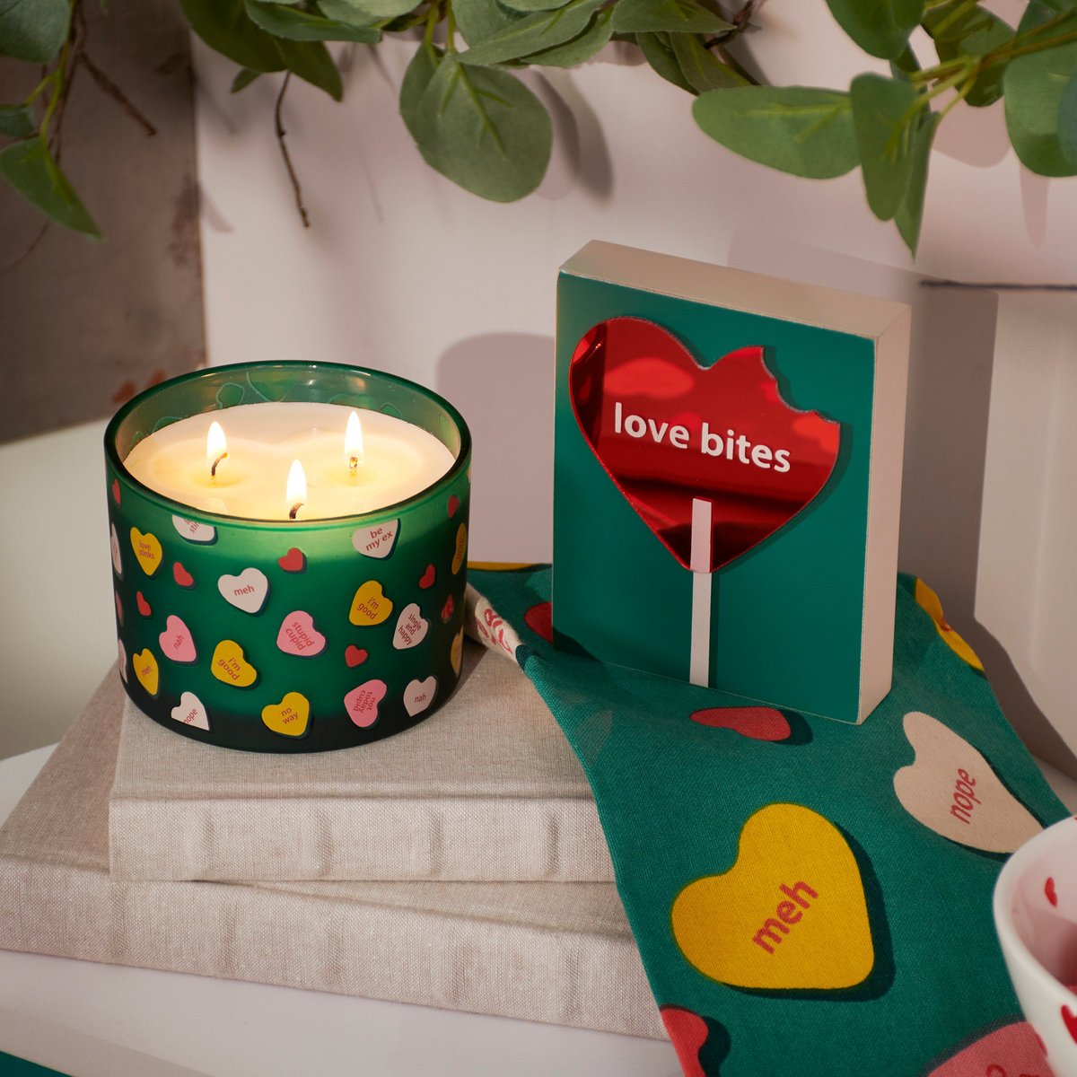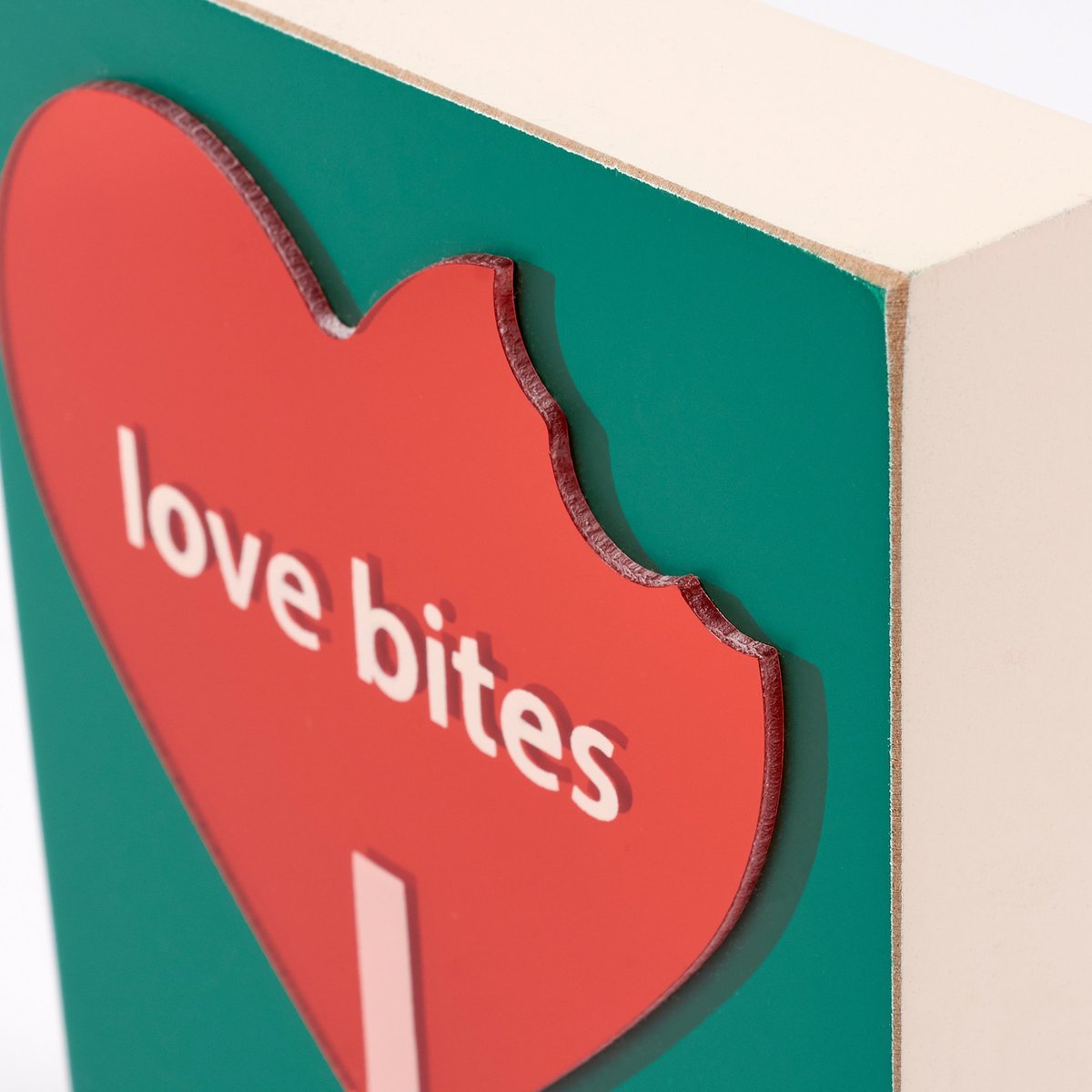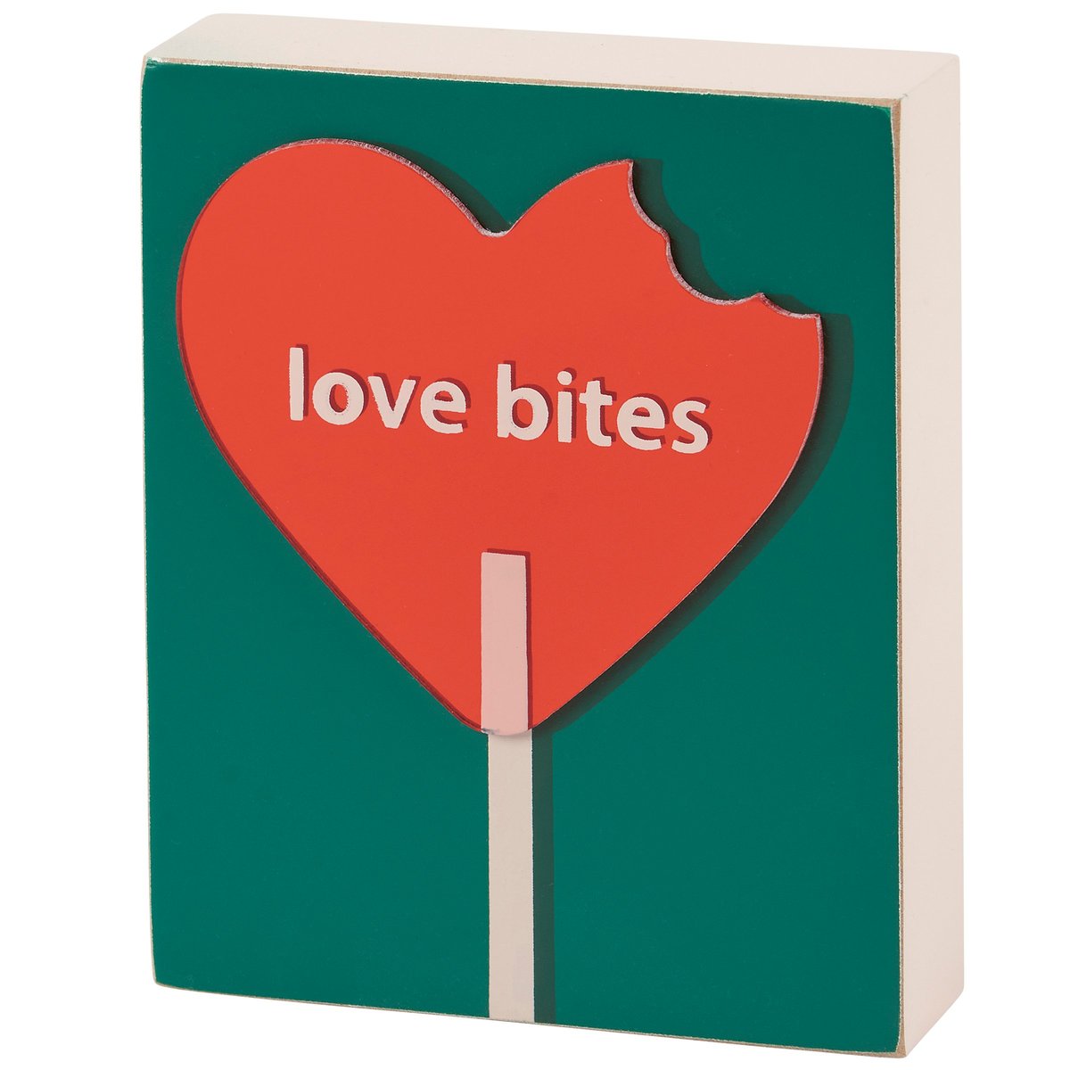 A wooden block sign from our Valentine's Day Collection displaying an anti-valentine inspired design perfect for a fun alternative for valentine's day gifting. Design features heart-shaped lollipop with a bite displaying "Love Bites" sentiment made using red acrylic attached to wooden block sign for added dimension. Seasonal block sign also features coordinating cream color on the sides and back. Our Love Bites block sign is easy to hang via predrilled keyhole slot or can free-stand alone. A fun Valentine's Day gift that can be easily displayed in any home or work space.
