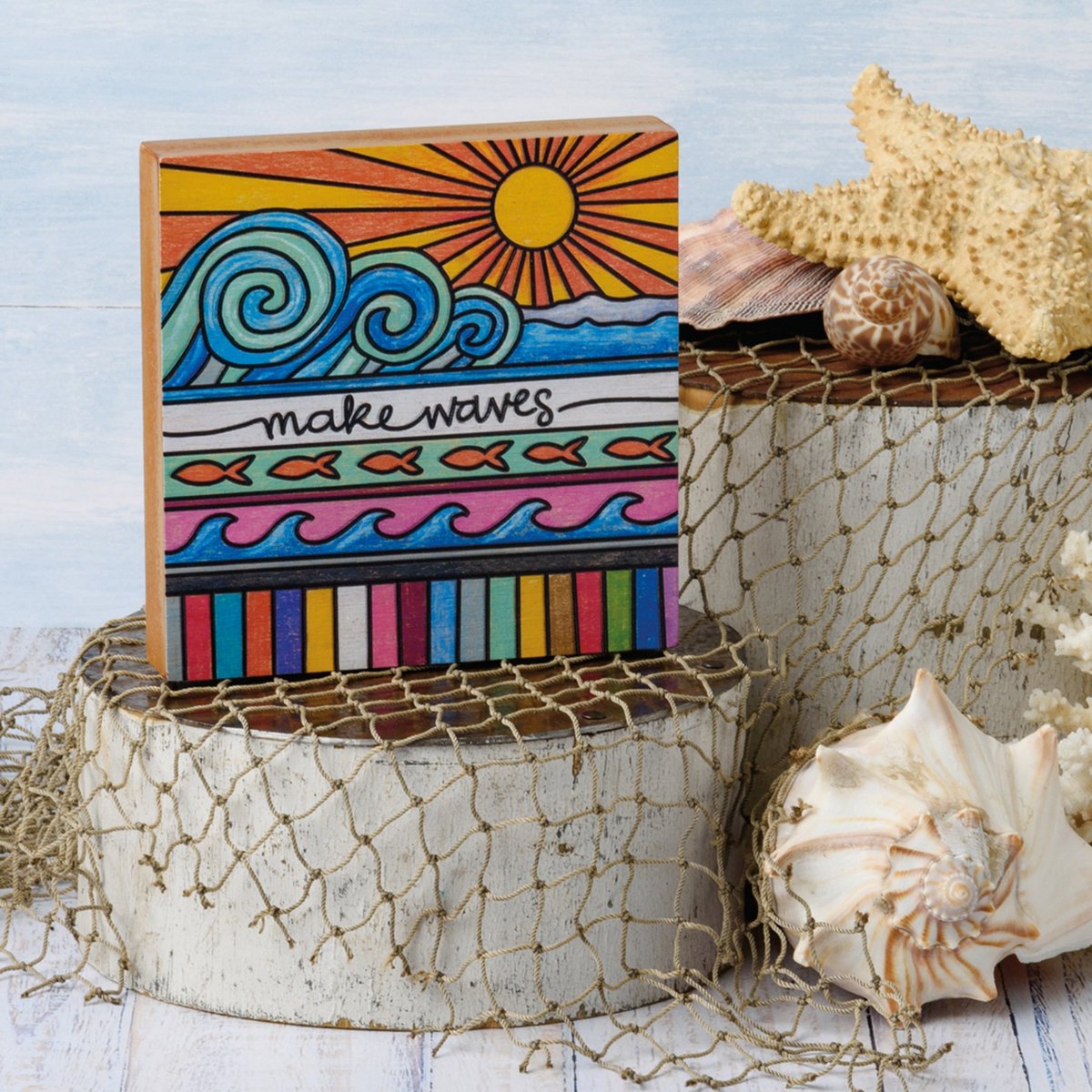 A wooden block sign from our Beach Collection features "Make Waves" sentiment with vibrant wood burned beach scene design. Natural wood sides make the design pop. Our Make Waves box sign is easy to hang via predrilled keyhole slot or can free-stand alone.