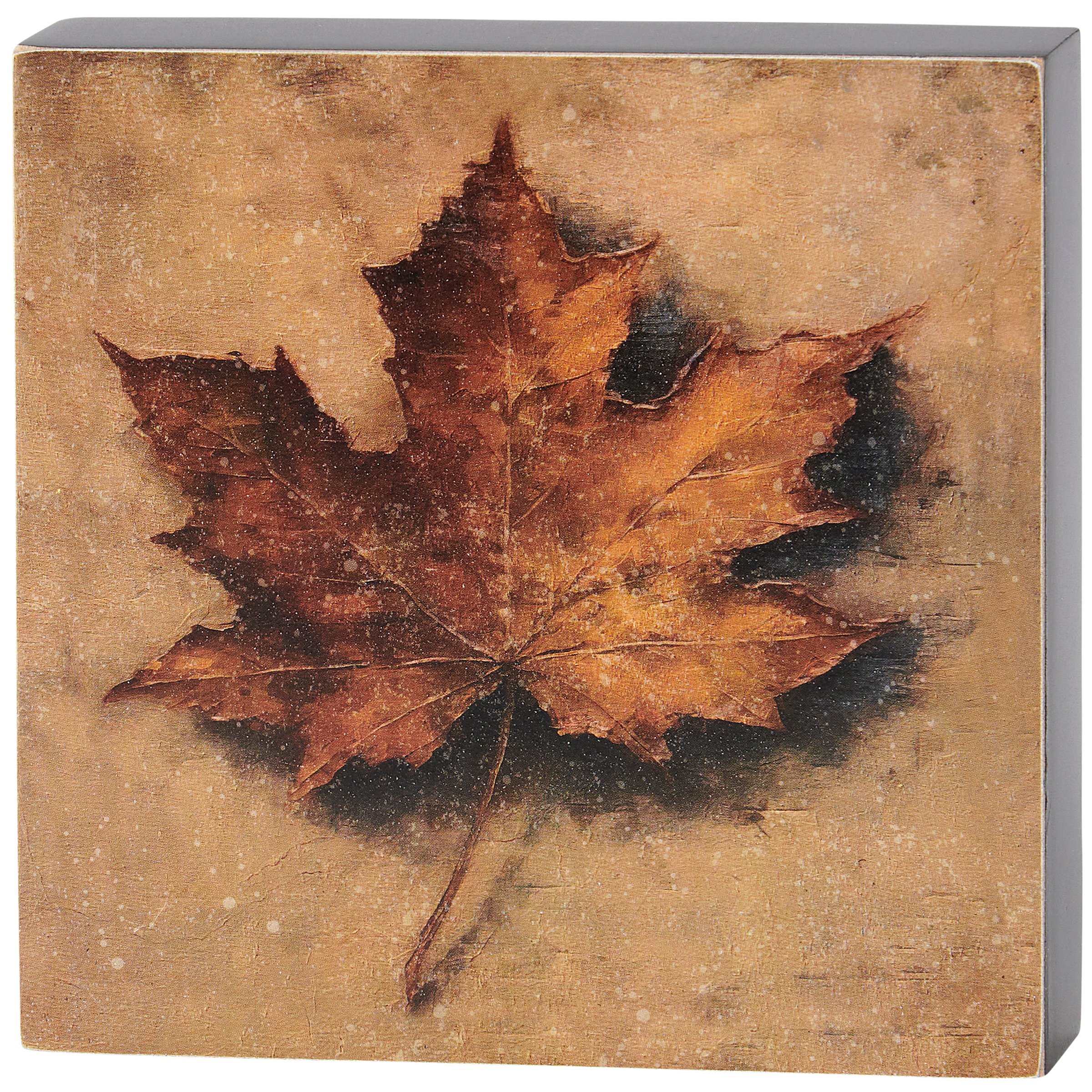 A wooden block sign from our Halloween Collection displaying rustic still life art of a maple leaf. Seasonal block sign features distressed details with coordinating black color on the sides and back. Our Maple Leaf block sign is easy to hang via predrilled keyhole slot or can free-stand alone. A rustic seasonal home accent that can be easily displayed in any home or work space.