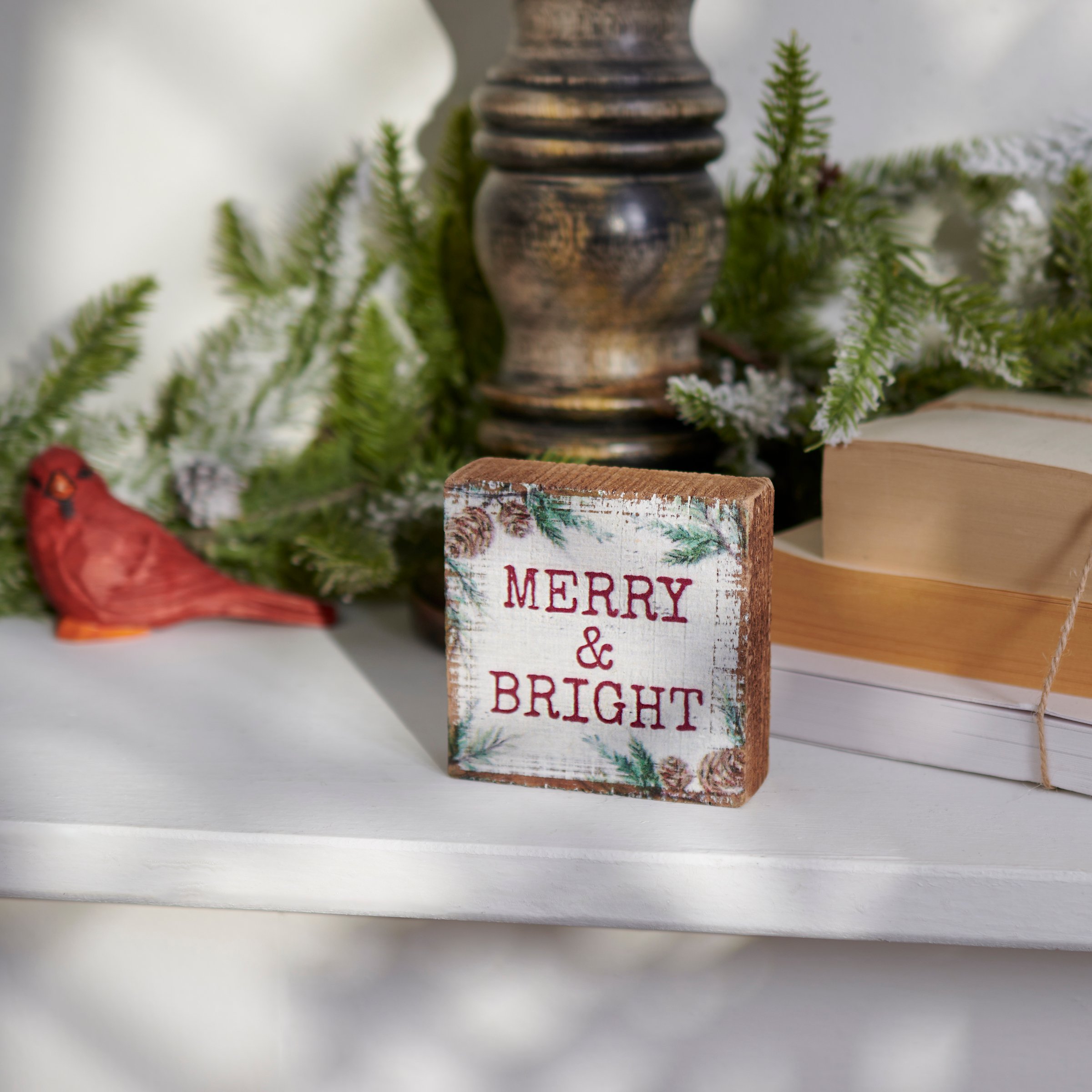 A wooden block sign from our Christmas Collection displaying winter greenery accenting a Christmas-themed sentiment that reads "Merry & Bright." Design is replicated from original artwork painted onto burlap canvas, giving the art a unique depth and texture. Seasonal block sign features distressed details with coordinating natural wood on the sides and back. Our Merry & Bright sign is easy to hang via predrilled keyhole slot or can free-stand alone. A rustic seasonal home accent great for gifting that can be easily displayed in any home or work space.
