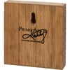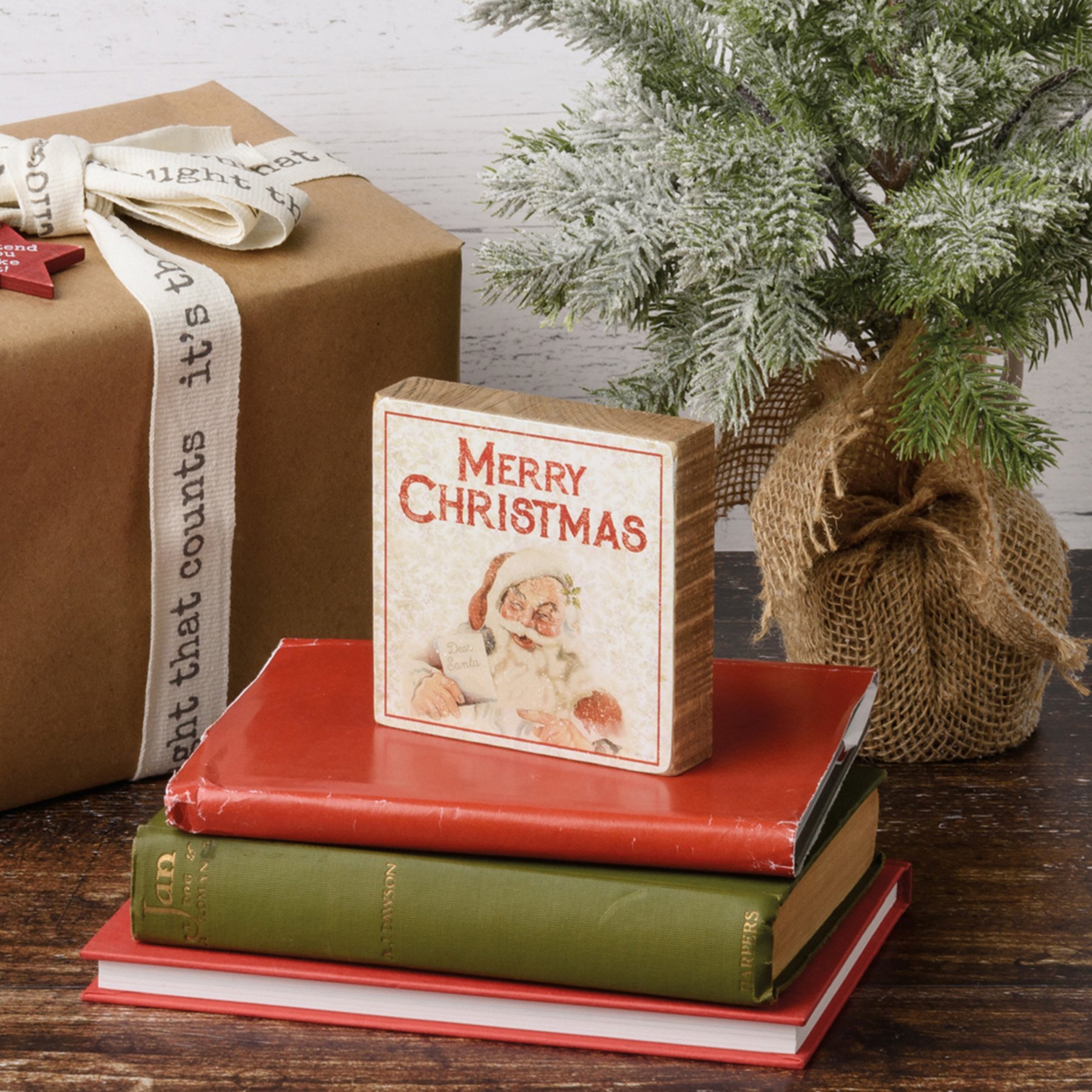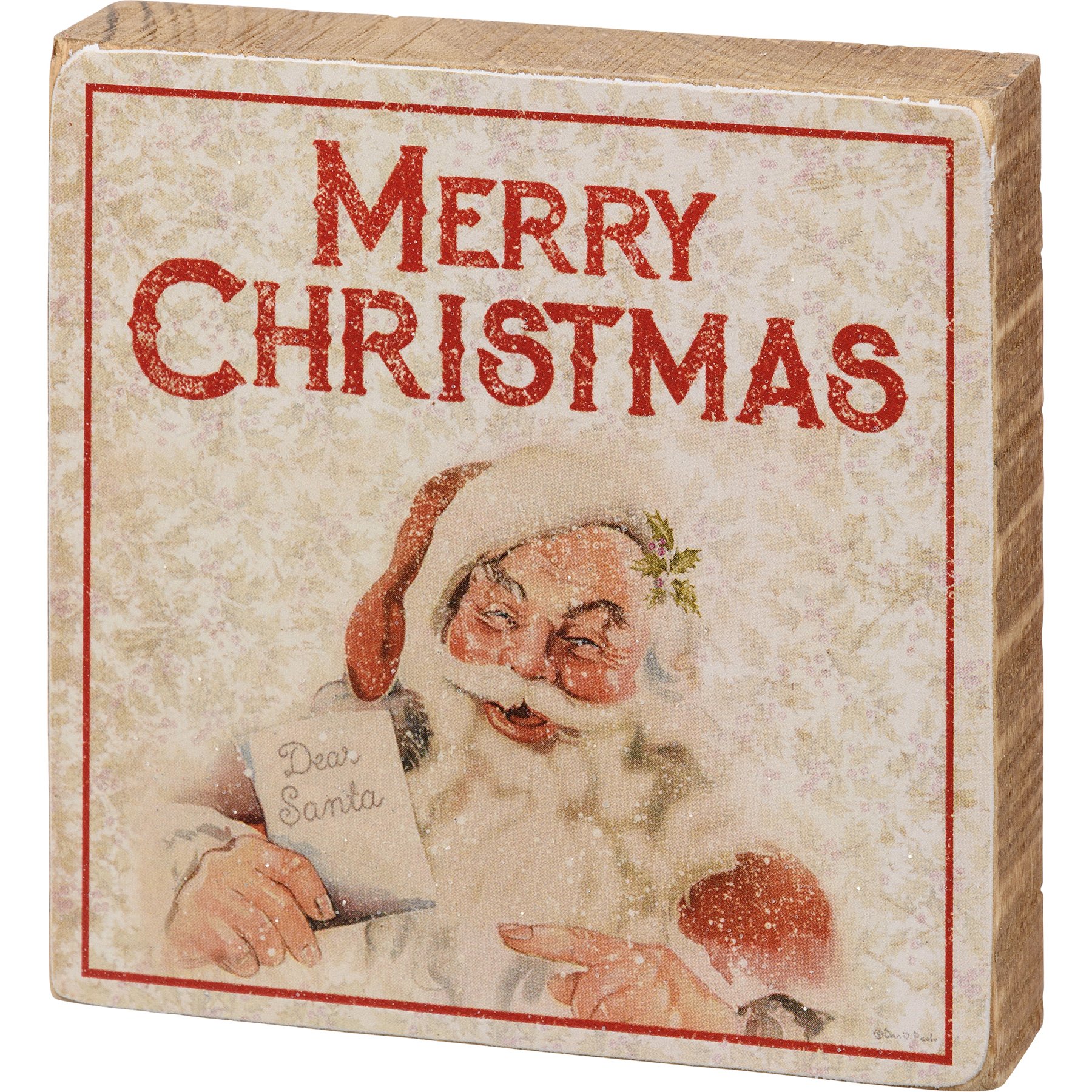 A wooden block sign featuring a vintage Santa Claus, "Merry Christmas" sentiment, faded holly background, and natural wood sides for added interest. Our Merry Christmas block sign is easy to hang via predrilled keyhole slot or can free-stand alone