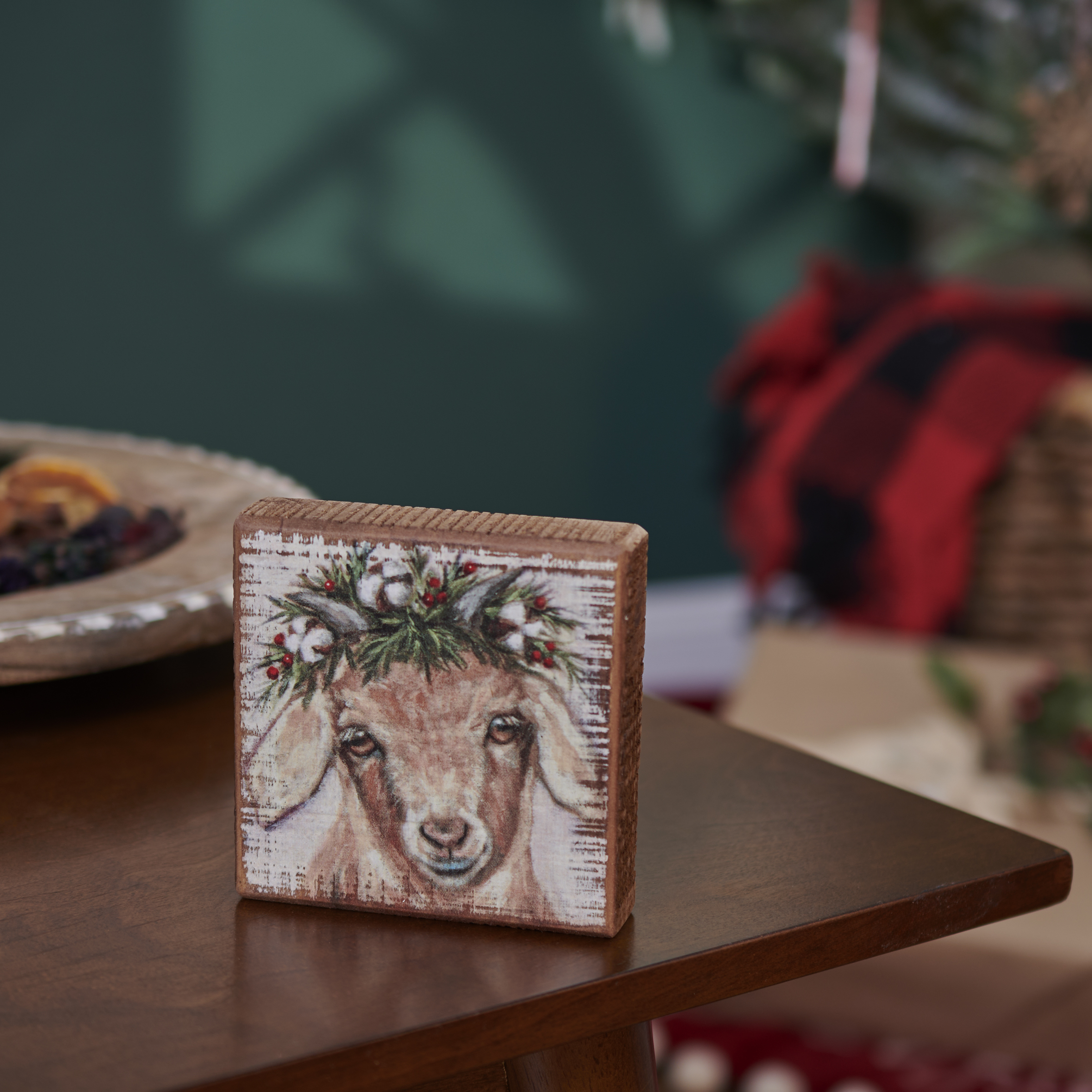 A wooden block sign from our Christmas Collection displaying a charming hand painted goat wearing a festive Christmas crown. Design is replicated from original artwork painted onto burlap canvas, giving the art a unique depth and texture. Seasonal block sign features distressed details with coordinating natural wood on the sides and back. Our Merry Goat sign is easy to hang via predrilled keyhole slot or can free-stand alone. A rustic seasonal home accent great for gifting that can be easily displayed in any home or work space.