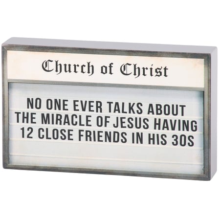A wooden block sign from our Faith Collection displaying a church sign inspired design with a funny faith sentiment that reads "No One Ever Talks About The Miracle Of Jesus Having 12 Close Friends In His 30s." Church sign features coordinating gray color on the sides and back. Our Miracle Of Jesus sign is easy to hang via predrilled keyhole slot or can free-stand on flat surface for display. A fun faith-themed home accent that can be easily displayed in any home or work space.