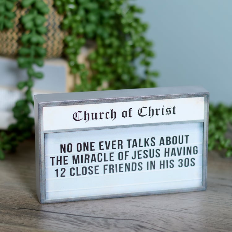 A wooden block sign from our Faith Collection displaying a church sign inspired design with a funny faith sentiment that reads "No One Ever Talks About The Miracle Of Jesus Having 12 Close Friends In His 30s." Church sign features coordinating gray color on the sides and back. Our Miracle Of Jesus sign is easy to hang via predrilled keyhole slot or can free-stand on flat surface for display. A fun faith-themed home accent that can be easily displayed in any home or work space.