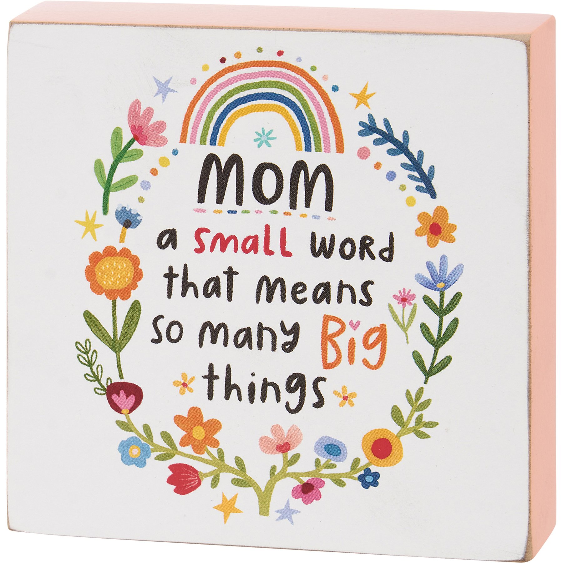 An inspirational wooden block sign from our Mother's Day Collection displaying a vibrant hand painted floral design with rainbows and loving sentiment. Hand illustrated sentiment reads "Mom - A Small Word That Means So Many Big Things." Sides feature pink color for added interest. Our Mom A Small Word Big Things block sign is easy to hang via predrilled keyhole slot or can free-stand alone.