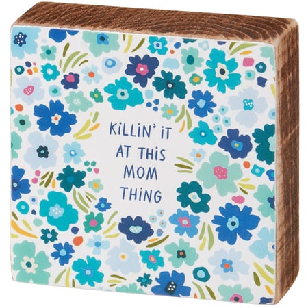 A colorful wooden block sign from our Mother's Day Collection displaying a vibrant hand illustrated design of flowers in a blue color palette surrounding a fun mom-themed sentiment that reads "Killin' It At This Mom Thing." Block sign features coordinating natural wood on the sides and back. Our Mom Thing block sign is easy to hang via predrilled keyhole slot or can free-stand alone. A lovely gift perfect for Mother's Day or as an everyday home accent.