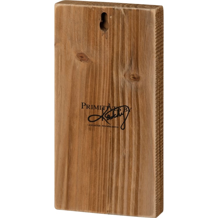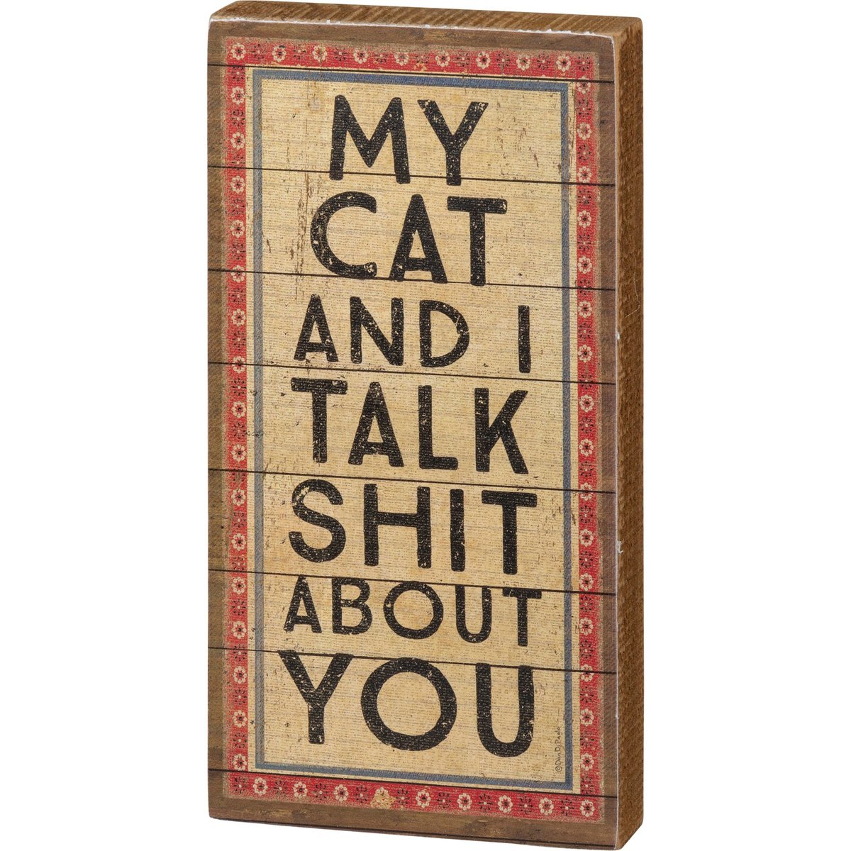 A rustic wooden block sign featuring "My Cat And I Talk Shit About You" sentiment and floral design border pattern. Easily hangs by predrilled keyhole slot or can free-stand alone.