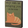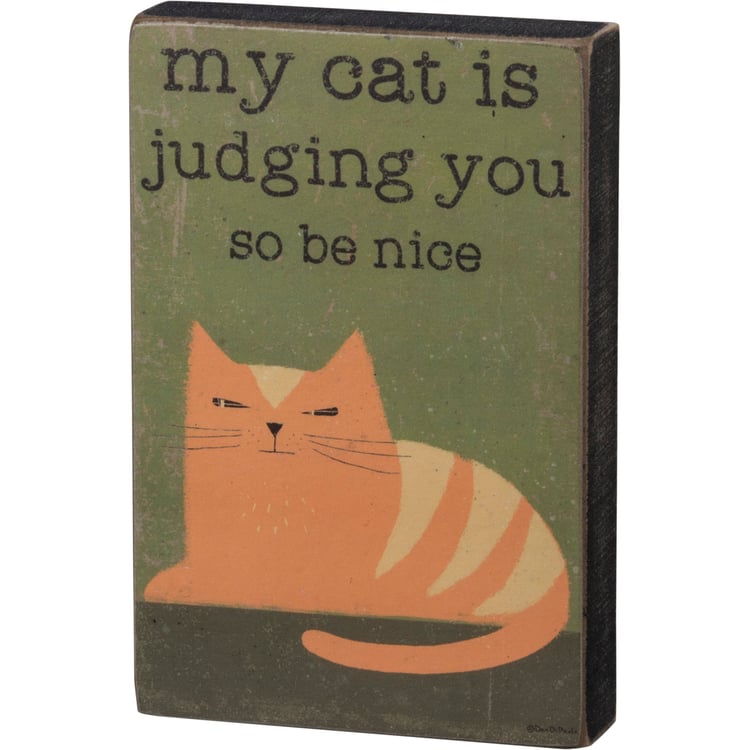 A rustic-inspired wooden block sign featuring a "My Cat Is Judging You So Be Nice" sentiment with smug cat design. Contains predrilled back keyhole for easy hanging or can free-stand alone. Complements well with coordinating pieces in collection for a sassy pet display.