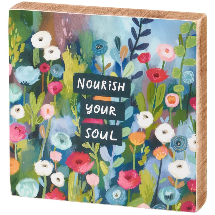 A colorful wooden block sign from our Inspiration & Blooms Collection displaying vibrant hand illustrated florals behind an inspirational sentiment that reads "Nourish Your Soul." Block sign features coordinating natural wood on the sides and back. Our Nourish Your Soul sign is easy to hang via predrilled keyhole slot or can free-stand alone. An inspirational everyday home accent great for gifting that can be easily displayed in any home or work space.