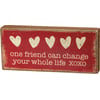 A wooden block sign featuring a rustic heart design and a "One Friend Can Change Your Whole Life XOXO" sentiment. Contains predrilled back keyhole slot for easy hanging or can free-stand alone. Complements well with other pieces in collection.
