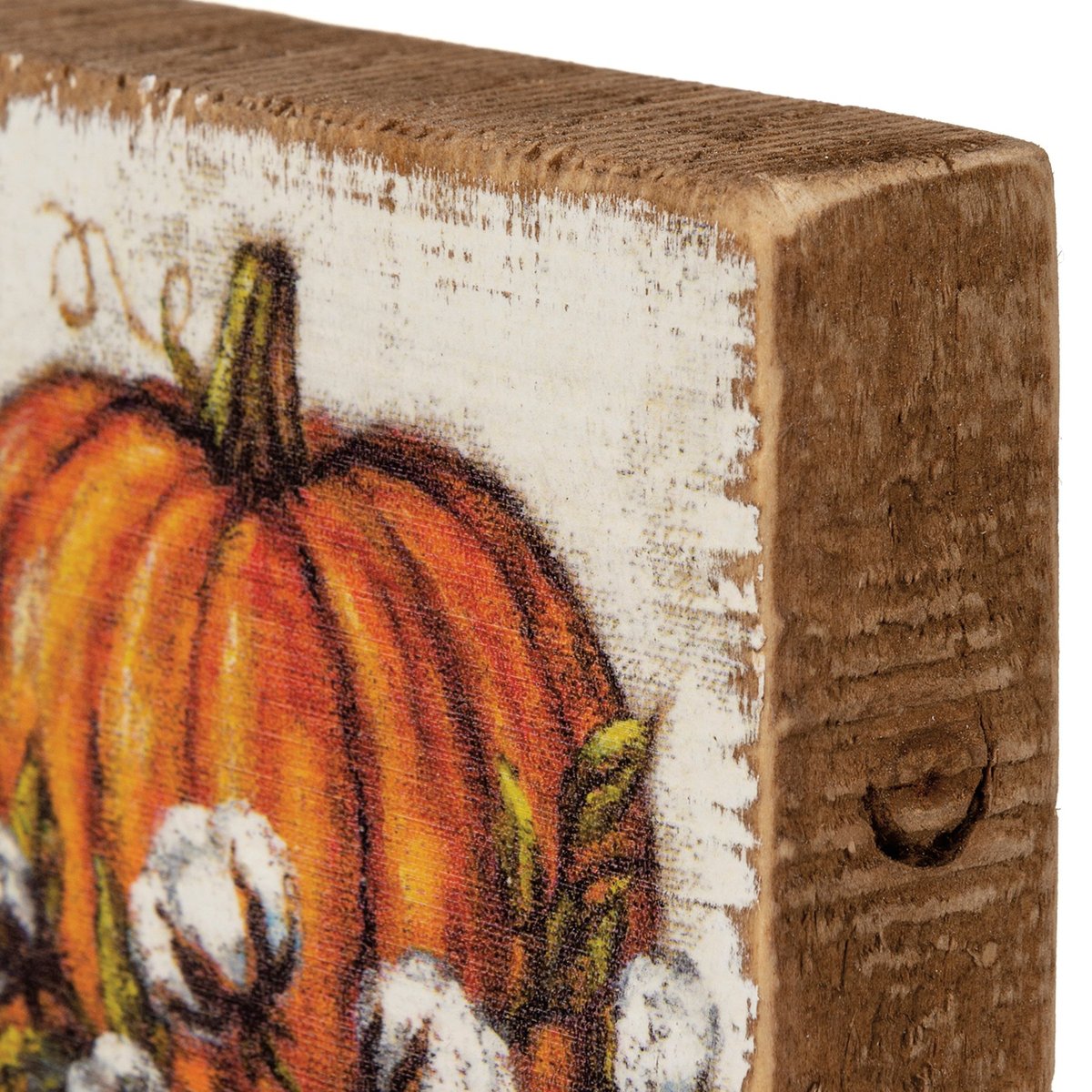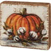 A wooden block sign featuring an orange pumpkin with cotton stem details. Design is replicated from original artwork painted onto burlap canvas, giving the art a unique depth and texture. Easy to hang via predrilled keyhole slot or can free-stand alone.