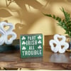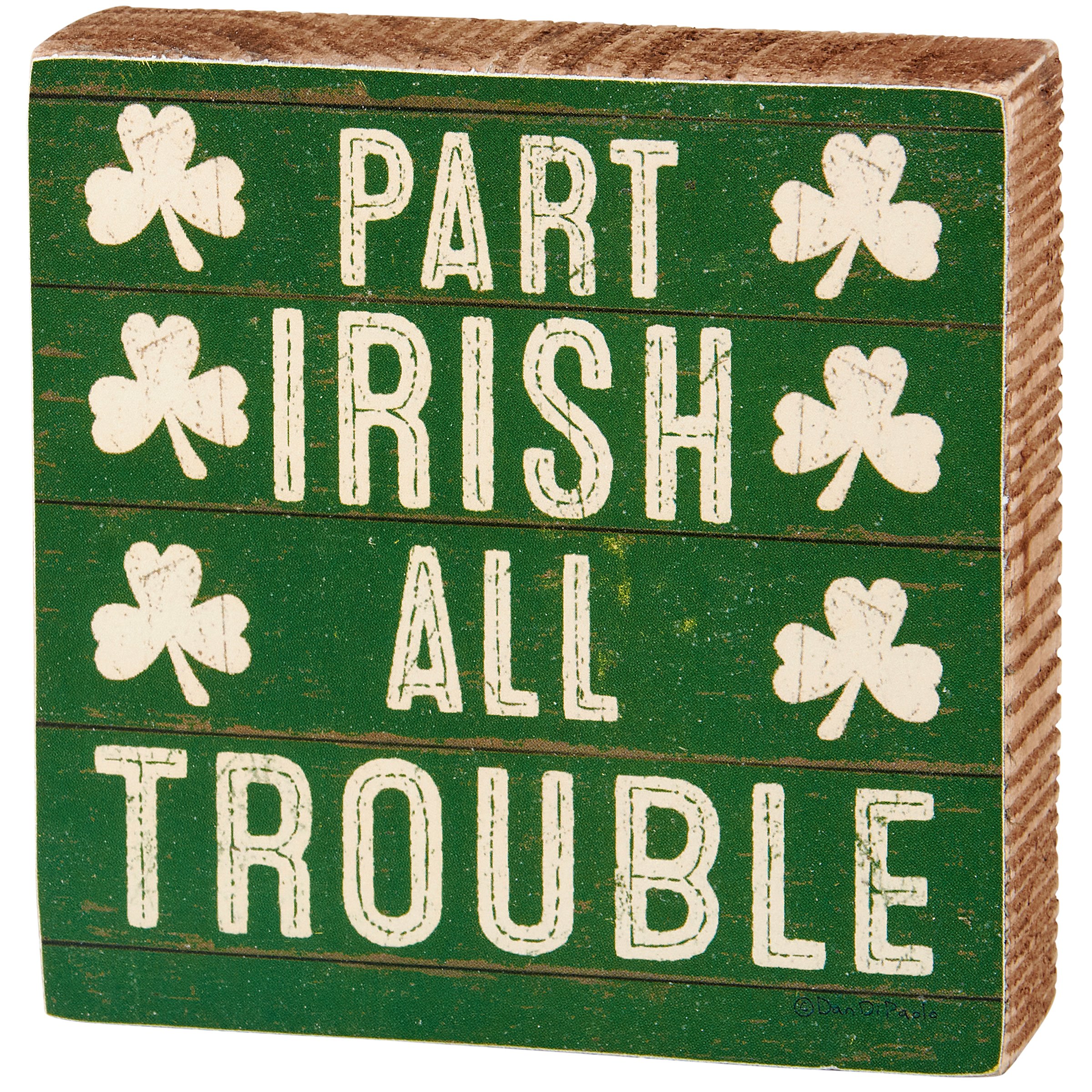 A wooden block sign from our St. Patrick's Day Collection displaying shamrocks and a humorous St. Patrick's Day themed sentiment that reads "Part Irish All Trouble." Design features rustic style with slat wood accents. Block sign features distressed details with coordinating natural wood on the sides and back. Our Part Irish block sign is easy to hang via predrilled keyhole slot or can free-stand alone. A seasonal home accent with a variety of display options.